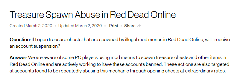 في هذه اللحظة و انا اكتب هذا التقرير جاء رد من شركة روكستار حول هذه القضية و اكدت انها على دراية بما يحدث و انها تعمل في الوقت الراهن لسد الثغرة التي يعمل من خلالها برنامج The treasure chest spawner بينما سينظر فريق مختص في حالات الاغلاق و الشكاوى من اجل معالجة الامر.