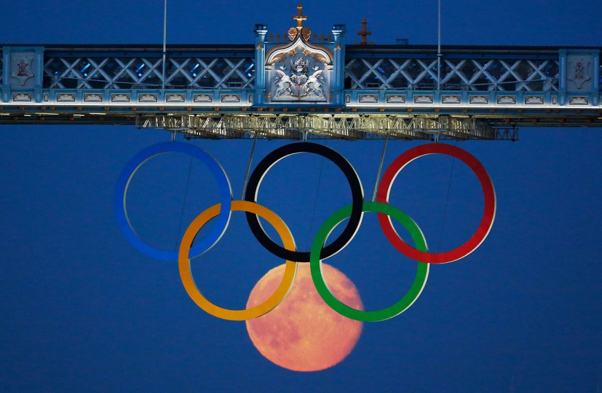 القمر يكمل شعار أو حلقات الاولمبية و التي علقت تحت جسر برج لندن خلال دورة الألعاب الأولمبية لعام 2012