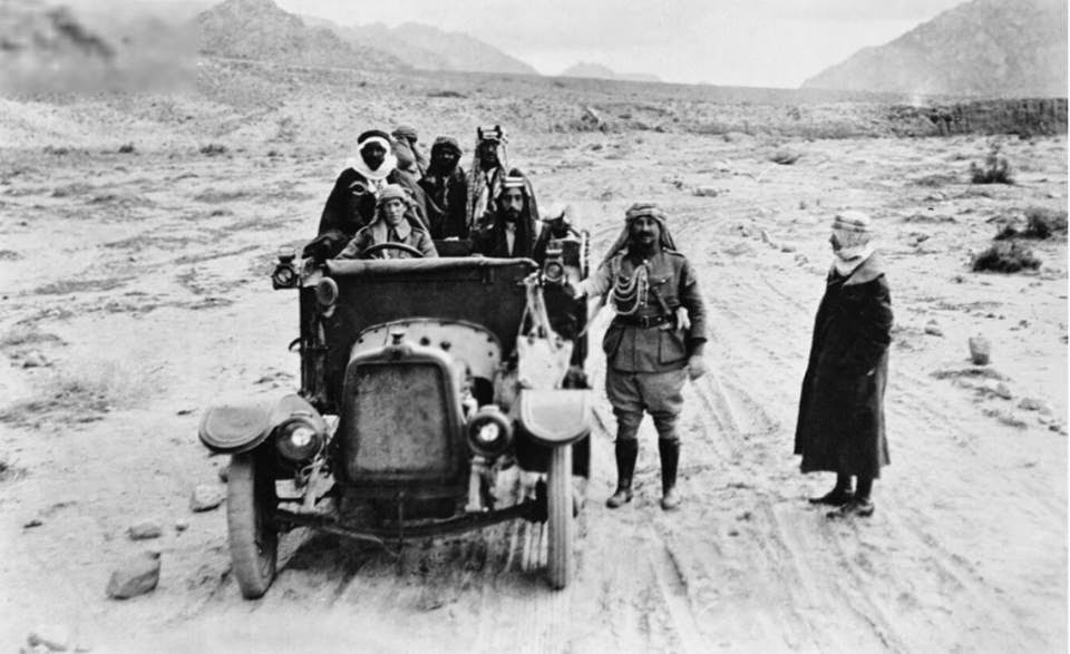 فيصل الاول بن حسين بن علي الهاشمي { الأمير آنذاك } الذي يجلس في المقعد الأمامي بجانب السائق مع توماس إدوارد لورنس المعروف باسم لورنس العرب مع مجموعه من المرافقين