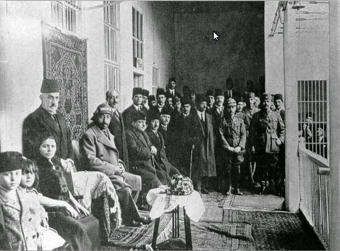 مدرسة لورا خضوري الملك فيصل الأول الى يمينه ساسون حسقيل وليساره جعفر 1924العسكري
