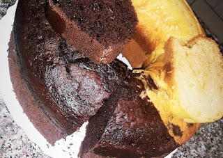 سكب الخليطين سويا (على كل جانب خليط) في القالب