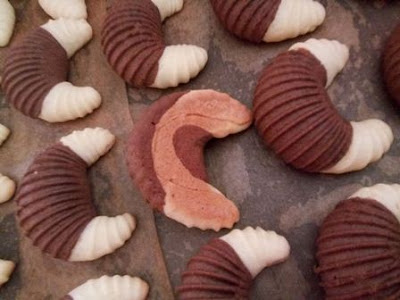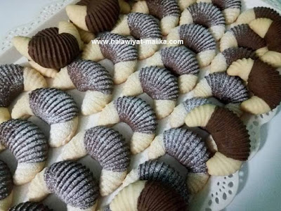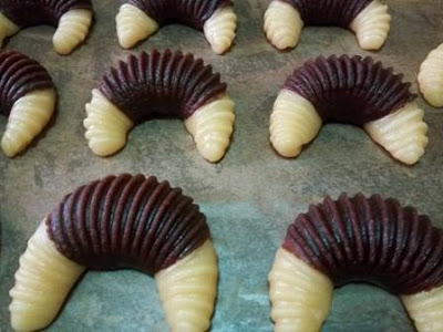 - ثم تشكل هلال, وترص في صينية الفرن وتطهى حلوة المشط في فرن مسخن من قبل 160 درجة مدة 15 إلى 20 دقيقة.