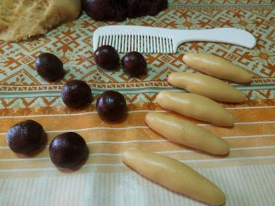 - تقطع العجينة البنية كرات صغيرة الحجم وزن 10غ وتقطع العجينة البيضاء كرات وزن 25 إلى 30غ ثم تشكل أصابع.