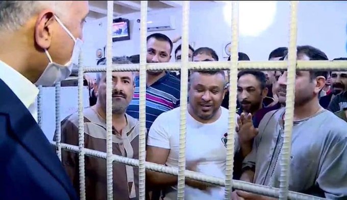 زيارة السيد الكاظمي لسجن 7 نجوم في مطار المثنى اقل ما يقال عنها مبتذلة اطمئن فيها على (( حجّي حمزة )) صاحب محلات الدعارة وصالات الروليت المتظاهرين المعتقلين تجدهم في مزرعة شبل الزيدي وسجون صدر القناة ولن تجد فيها مكيفات او شاشة تلفاز بل دماء وظلام واداوات تعذيب !!