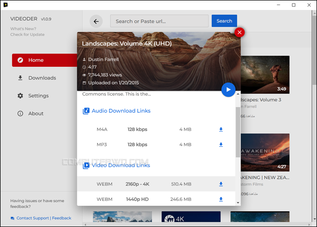 ولا يشترط البرنامج أن يكون لديك عنوان URL للمقطع، فيمكنك البحث عن اسمه ومشاهدته وتحميله بالجودة المفضلة من داخل نافذة البرنامج. علاوة على ذلك، إذا كنت مهتمًا بالصوت فقط، فيمكنك تنزيل ملف الـ MP3 أو M4A من قائمة خيارات الفيديو. لذا فأنصح بتجربته، خصوصًا وانه مجاني تمامًا. [تحميل البرنامج]