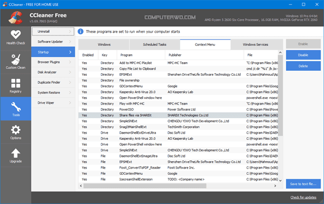 بعد تحميل وتثبيت CCleaner ولاحظ اثناء التثبيت أن تقوم برفض تحميل البرامج الملحقة مثل AVG حيث سيعرض عليك تثبيته فلا تقوم بالضغط بالخطأ. ثم تقوم بالذهاب الي الادوات Tools ثم تقوم بالضغط علي اداة Startup ثم تقوم بالذهاب الي نافذة Context Menu والان يظهر لك كل خيارات قائمة الكليك يمين المتاحة لك فسنبدأ في تعطيل ما لا نريد.