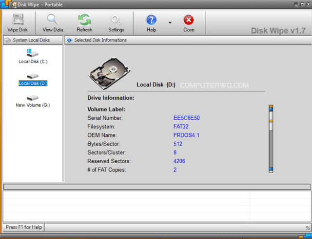 Disk Wipe هو تطبيق مجاني لحذف جميع بيانات القرص الصلب ومنع استرداد تلك البيانات، حيث أن تهيئة محركات الأقراص الثابتة باستخدام الطرق العادية يترك إمكانية لاستعادة البيانات مرة أخرى، ولذلك فإن Disk Wipe يقوم بحل هذه المشكلة بكفاءة عالية عن طريق استخدام خوارزميات قوية بحيث تجعل إمكانية استعادة البيانات المحذوفة تكاد تكون معدومة. واجهة البرنامج بسيطة للغاية ويعرض لك جميع الأقسام الخاصة بجهازك.