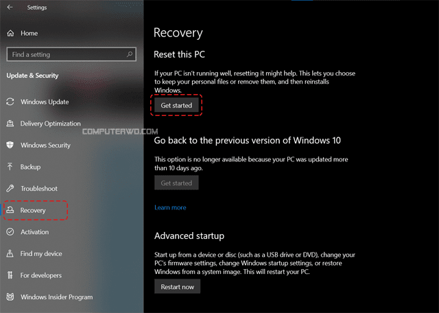 بمساعدة أداة الاسترداد "Recovery" الموجودة في ويندوز 10 يمكنك حذف جميع ملفاتك من القرص الصلب بشكل نهائي. أولاً، قم بالانتفال إلى الاعدادات، ثم بعد ذلك قم بالتوجه إلى قسم التحديث والأمان "Update & Security" ومن خلال الشريط الجانبي قم بالضغط على "Recovery"، ثم بعد ذلك قم بالضغط على زر "Get Started".