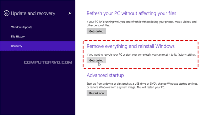 إذا كنت تستخدم ويندوز 8.1، فقم بالتوجه إلى الاعدادات أولاً، ثم بعد ذلك قم بالانتقال إلى تغيير إعدادات الكمبيوتر "Change PC Settings" ثم إلى قسم التحديث والاسترداد " Update and recovery" وبعد ذلك قم بالضغط على "Recovery" من الشريط الجانبي في النافذة الظاهرة أمامك، ثم بعد ذلك قم بالضغط على زر "Get Started" الموجود تحت خيار إزالة كل شيء وإعادة تثبيت الويندوز.