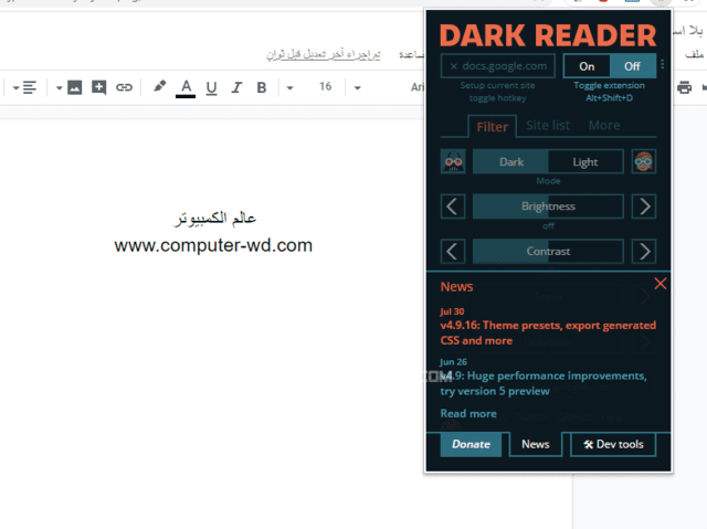 إذا كنت لا تمانع من تثبيت إضافة على المتصفح الخاص بك فيمكنك استخدام هذه الإضافة الرائعة والمميزة جدًا Dark Reader والتي تمكنك من تشغيل الوضع الليلي على مختلف المواقع بشكل رائع جدًا حتى أفضل من الطريقة السابقة، كما أنها سهلة جدًا في الاستخدام. في البداية قم بتحميل إضافة Dark Reader من خلال متجر كروم وانتظر حتى يتم تثبيت الأداة وبعد ذلك سوف يتم تفعيل الوضع الليلي على المتصفح الخاص بك فورًا، ويمكنك تشغيل أو إيقاف الوضع الليلي من خلال اختصارات لوحة المفاتيح بالضغط على الازرار (Alt + Shift + D) في أجهزة الويندوز أو (Option + Shift + D) في أجهزة الماك.