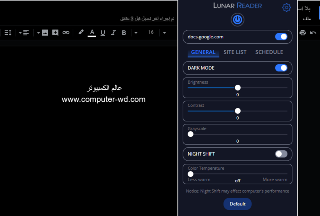 أداة Luna Reader هي عبارة عن إضافة أخرى من إضافات كروم والتي يمكنك استخدامها لتفعيل الوضع المظلم في مستندات جوجل أو المواقع الأخرى بدون مواجهة أية مشاكل، وما يميز هذه الأداة عن الأداة السابقة هي أنها تعتبر أبسط منها بكثير حيث أن قائمة الإعدادات الخاصة بها لا تحتوي على الكثير من الخيارات.