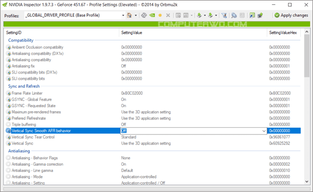 الإعدادت التي لا تظهر باللون الرمادي هي الاعدادات الأساسية، والتي تتوافق مع الاعدادات التي يمكنك التحكم بها وتغييرها من خلال لوحة تحكم نيفيديا، ولتغيير أحد الاعدادات ما عليك سوى النقر فوق الاعداد، وسيظهر لك سهم منسدل على الجانب الأيمن من النافذة، ومن خلال هذا السهم يمكنك رؤية العديد من الخيارات المختلفة. بعد إجراء جميع التعديلات المناسبة لك، يمكنك حفظ الاعدادات الجديدة من خلال النقر على زر تطبيق التغييرات "Apply Changes".