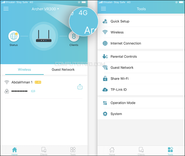 الان قم بفتح تطبيق TP-Link Tether على هاتفك بعد الاتصال بشبكة واي فاي اخرى او تفعيل بيانات الهاتف، وقم بتسجيل الدخول بنفس معرّف تي بي لينك المستخدم لتفعيل ميزة TP-Link Cloud في الراوتر. بعد ذلك سيظهر اسم الراوتر على الشاشة، فاضغط عليه لتظهر واجهة التحكم، والتي تبدو افضل بكثير من تلك التي تظهر على صفحة الراوتر في المتصفح.