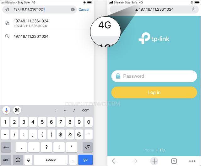 الآن، للوصول إلى الراوتر والتحكم فيه عن بعُد، ما عليك سوى الاتصال بشبكة واي فاي أخرى أو حتى تفعيل بيانات الهاتف (4G/3G) ثم تقوم بفتح أي متصفح وتكتب في شريط العنوان الـ IP (الفريد، والمحدد من قبل الشركة المزودة للخدمة، سواء كان ثابت أو متغير) متبوعًا برقم البورت الذي قمت بتعيينه عند تفعيل خاصية Remote Management، ولكن استخدم نقطتان رأسيتان (:) للفصل بين الآي بي والبورت، كما موضح في الصورة أعلاه. وبعد النقر على Enter ستظهر أمامك شاشة تسجيل الدخول إلى صفحة الراوتر، فاكتب اسم المستخدم وكلمة المرور واضغط Log in.
