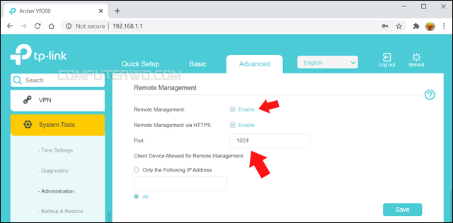 على راوتر TP-Link يمكنك تفعيل خاصية Remote Management بعد فتح صفحة التحكم ثم الانتقال إلى قسم Advanced والنقر على System Tools من القائمة الجانبية ثم النقر على Administration وبعدها تقوم بالتمرير إلى أسفل لتضع علامة [✔] بجوار Enable أمام Remote Management ويمكنك بعد ذلك تغيير البورت بدلًا من البورت المحدد افتراضيًا، وعند الانتهاء اضغط على زر Save بالأسفل، ثم سجل خروج من صفحة التحكم بالنقر على Log out.