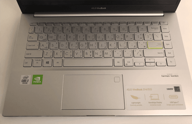 احد الامور المميزة في التصميم هو خلفية اللابتوب حيث أن لوجو ASUS VivoBook مميز جداً ويعطي لتصميم اللابتوب رونق مختلف تماماً ويأتي اللابتوب باربع الوان يمكنك الاختيار من بينها وقد احبب اللون الابيض وجسم اللابتوب لا يترك بصمات عليه كما وأن مفتاح الـ Enter علي اللابتوب يأتي بحواف باللون الاخضر جميلة.