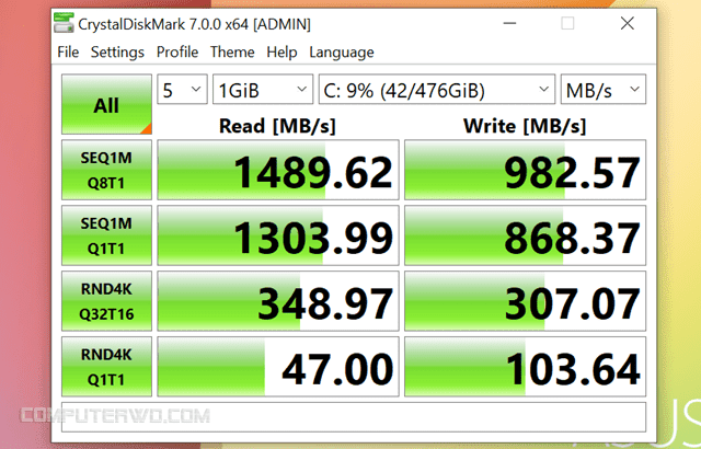 وقد قمنا باختبار الهارد لمعرفة سرعة القراءة والكتابة علي الهارد وهي 1.4 جيجا للقراءة و 900 ميجا للكتابة علي الهارد وهي سرعة مناسبة ولكنها ليست الاعلي في فئة هاردات الـ NVMe ولكنها بالتأكيد مناسبة للاستخدام العادي حيث أن اللابتوب موجه لفئة الطلبة، وعموماً هذه السرعة مناسبة جداً لجعل الجهاز سريع.