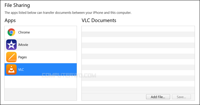 في هذا القسم ستجد قائمة بها التطبيقات المثبتة على الآيفون، ولكن تلك التي تدعم فقط إمكانية تخزين الملفات بها مباشرًة عن طريق نقلها من الكمبيوتر إلى ذاكرة الهاتف. لذلك، إذا قمت بتثبيت تطبيق VLC على جوالك، فسيظهر في القائمة، لذا اضغط عليه ثم اضغط على زر Add Files بالأسفل.