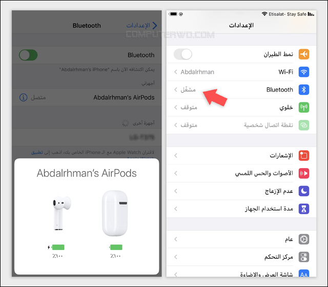 وضع سماعات AirPods في علبة الشحن هي أول خُطوة تحتاج ان تقوم بها، حيث لا يمكن تحديث السماعة أثناء الاستخدام. بعد ذلك تأكد من اتصال السماعات بالآيفون أو الآيباد الخاص بك، لفعل ذلك، انتقل إلى "الإعدادات" ثم "Bluetooth" وتأكد أن البلوتوث في وضع التشغيل. بعد ذلك، قم بفتح علبة الشحن (دون اخراج السماعات منها) وجعلها بالقرب من الهاتف وانتظر حتى يظهر مؤشر البطارية على الشاشة أو تظهر كلمة "متصل" أمام أسم السماعة اسفل قائمة "اجهزتي" وبمجرد التأكد من اتصال السماعة، اترك علبة الشحن مفتوحة.