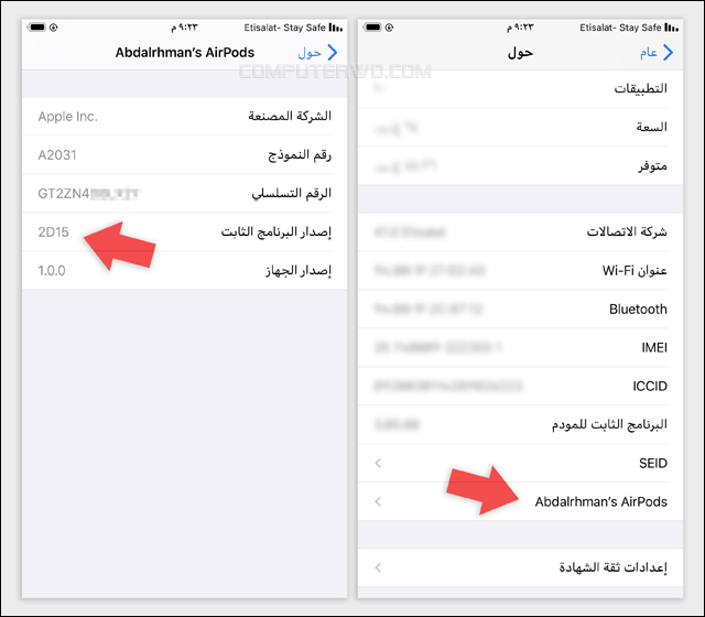 بعد ذلك، يجب عليك معرفة ما هو إصدار الـ Firmware الحالي لسماعات AirPods ؟ ولمعرفة ذلك، انتقل إلى "الإعدادات" ثم "عام" وبعد ذلك اضغط على "حول" وقم بالتمرير إلى أسفل حتى تلاحظ وجود اسم الآيربودز في القائمة، اضغط على الاسم وفي الشاشة التالية تظهر معلومات عن السماعة مثل رقم الموديل والرقم التسلسلي، وإصدار البرنامج الثابت (Firmware) هذا هو الرقم الذي ينبغي التحقق منه، والمفترض أن يتغير بعد حصول السماعة على تحديث جديد.