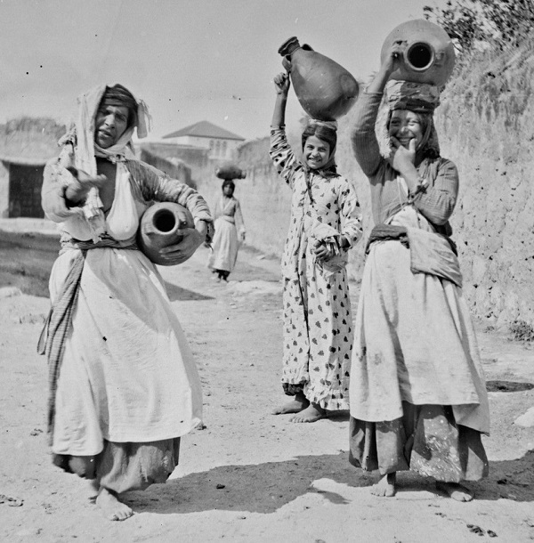 فتيات يحملن جرار الماء، اثنتان منهما تضحكان في براءة والثالثة تشير بيدها نحو الكاميرا باستنكار - الناصرة