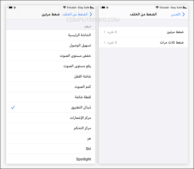 يمكنك بعد ذلك البدء في تحديد الإجراءات حسب عدد النقرات، فاضغط على "ضغط مرتين" أو "ضغط ثلاث مرات" لتظهر قائمة معبأة بالأوامر مثل فتح مُبدل التطبيق والتقاط الشاشة وقفل الشاشة وعرض مركز الاشعارات أو الوصول للشاشة الرئيسية أو كتم الصوت... هناك عدد كبير من الإجراءات المُتاحة لتحدد منها ما شئت؛ وهو ما سيساعدك على استخدام الهاتف بشكل أكثر سهولة مما سبق.