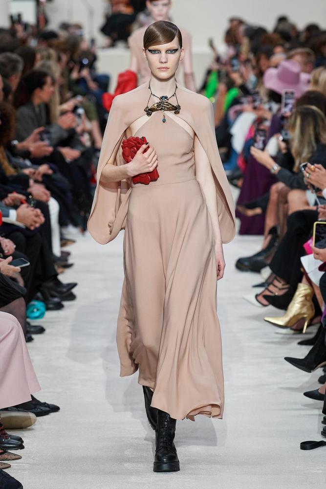 هو المنافس الوحيد للون الأسود في فصلي الخريف والشتاء، وهذا العام قدمت لوكات كاملة باللون الجملي، اعتمدي الفساتين الفاتحة القريبة للون الجلد والمصممة بخصر عالي من توقيع دار فالنتينو Valentino لتبرزي طولك واكملي اناقتك بحقيبة كلاتش باللون الأحمر.