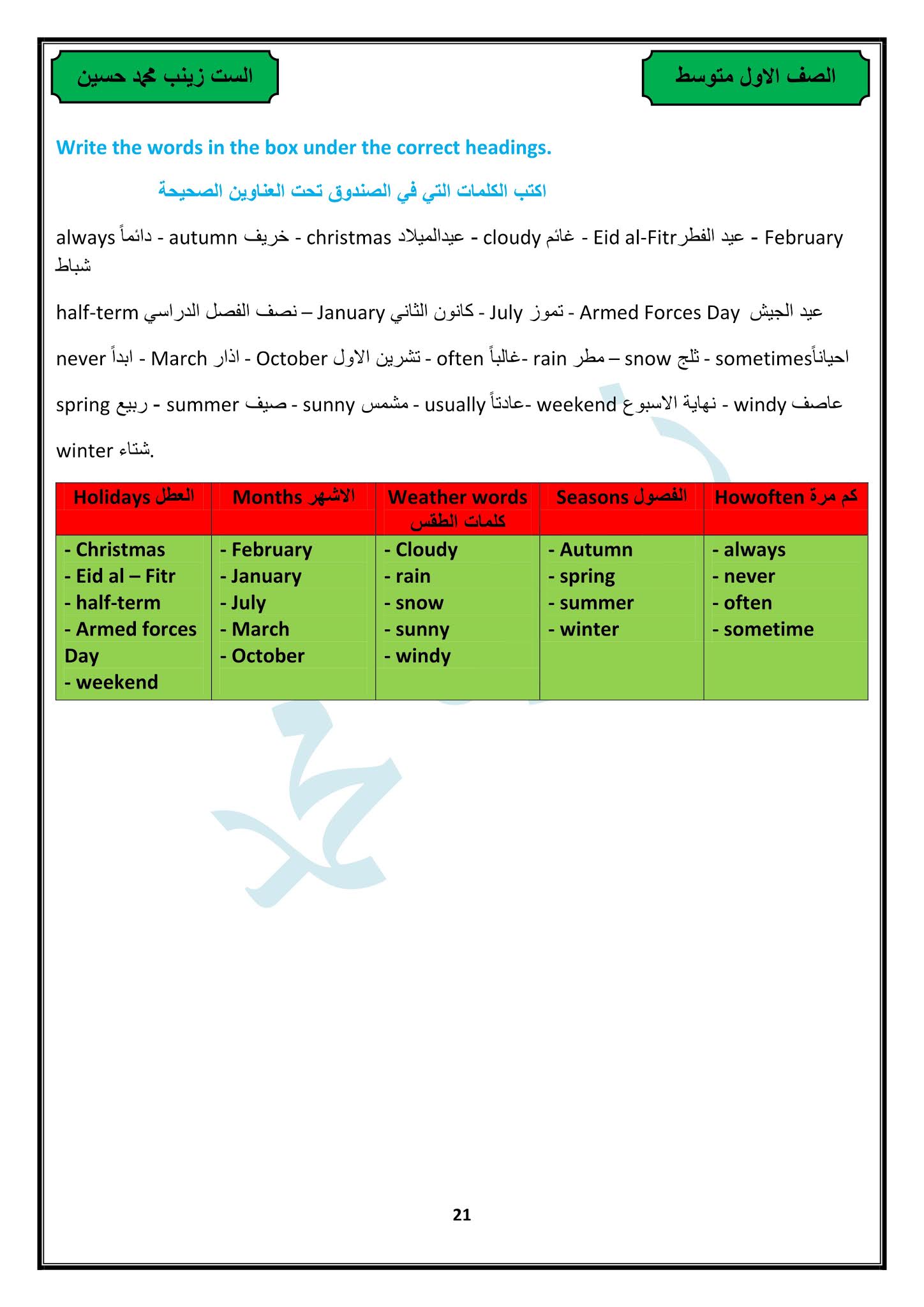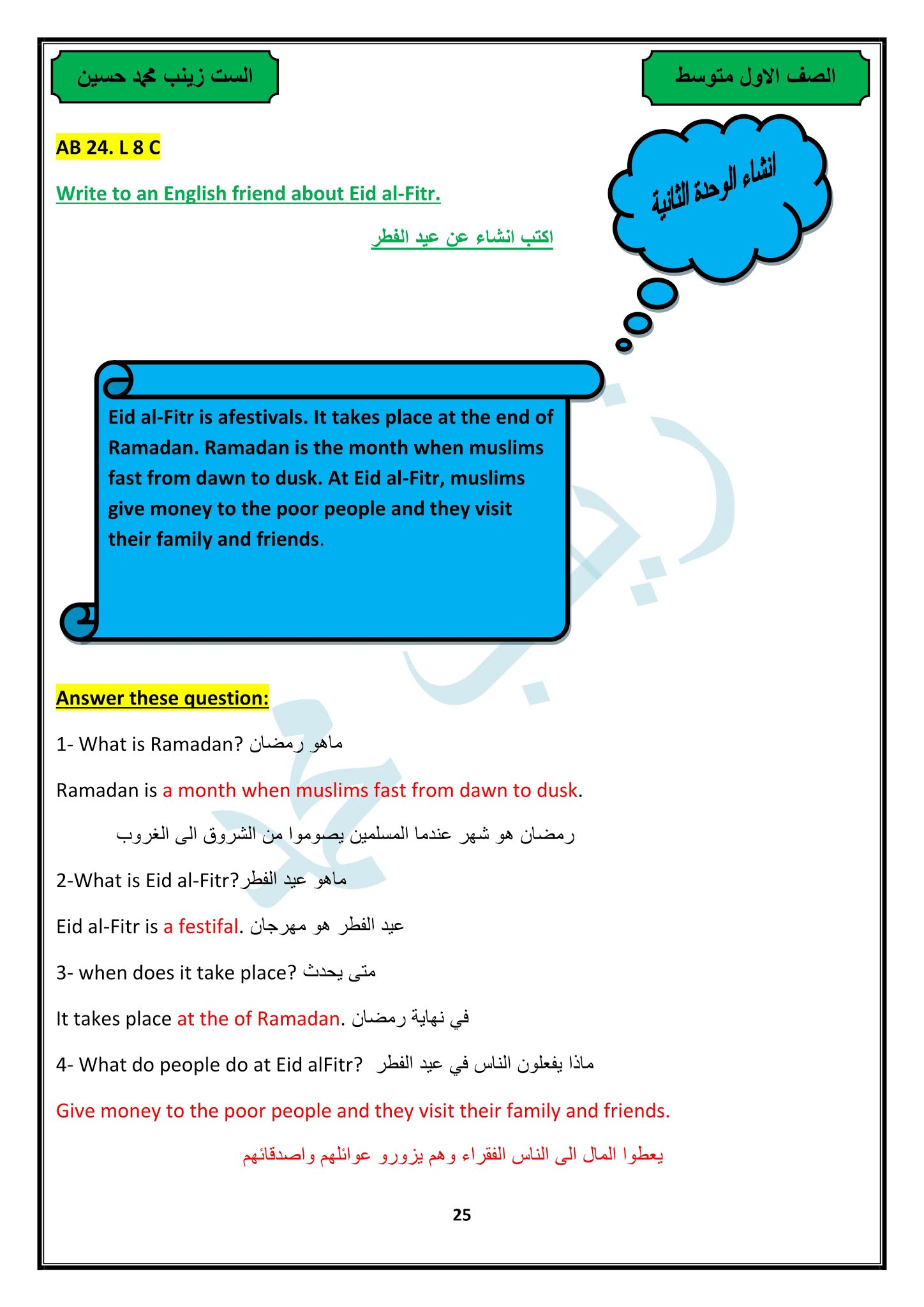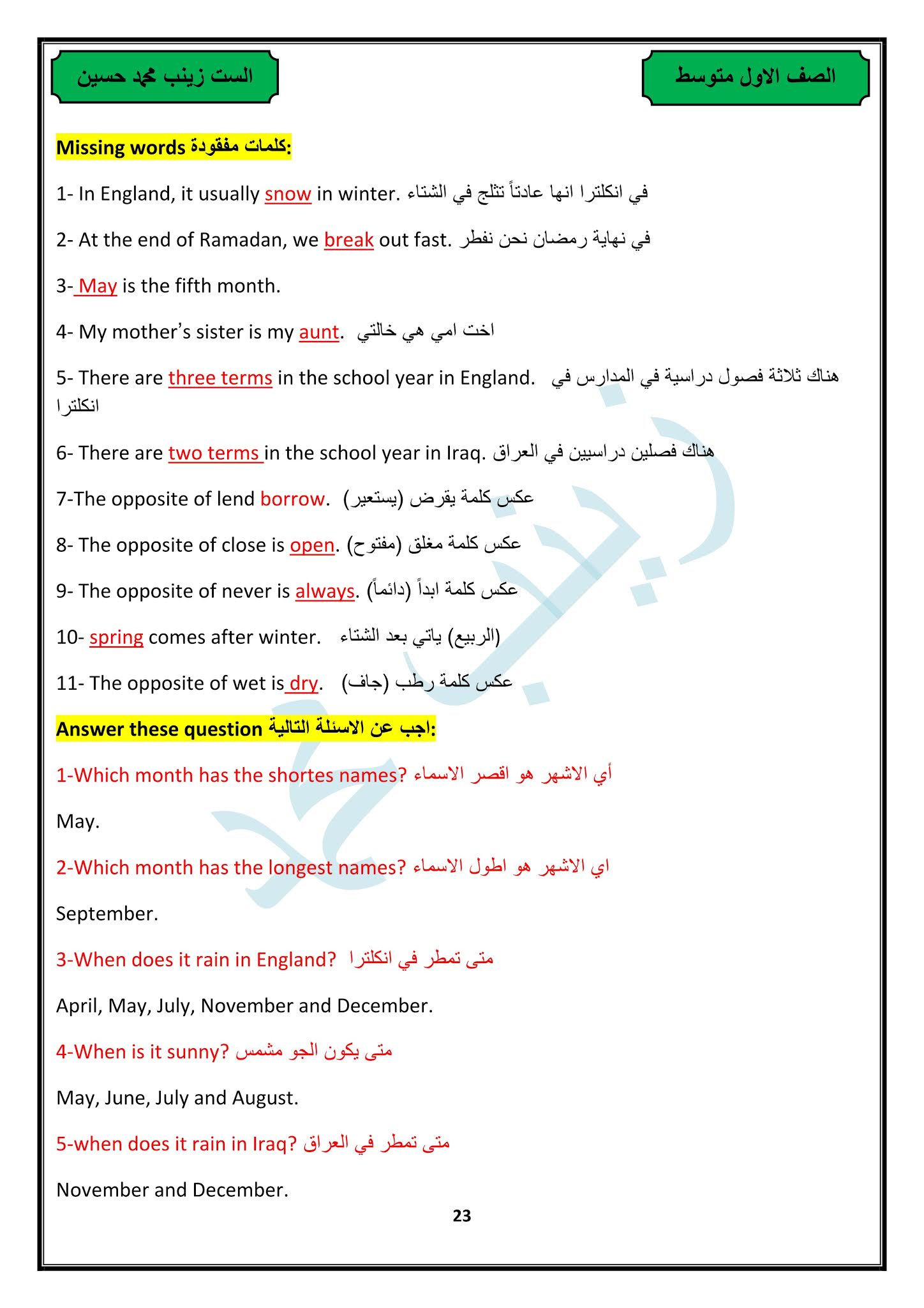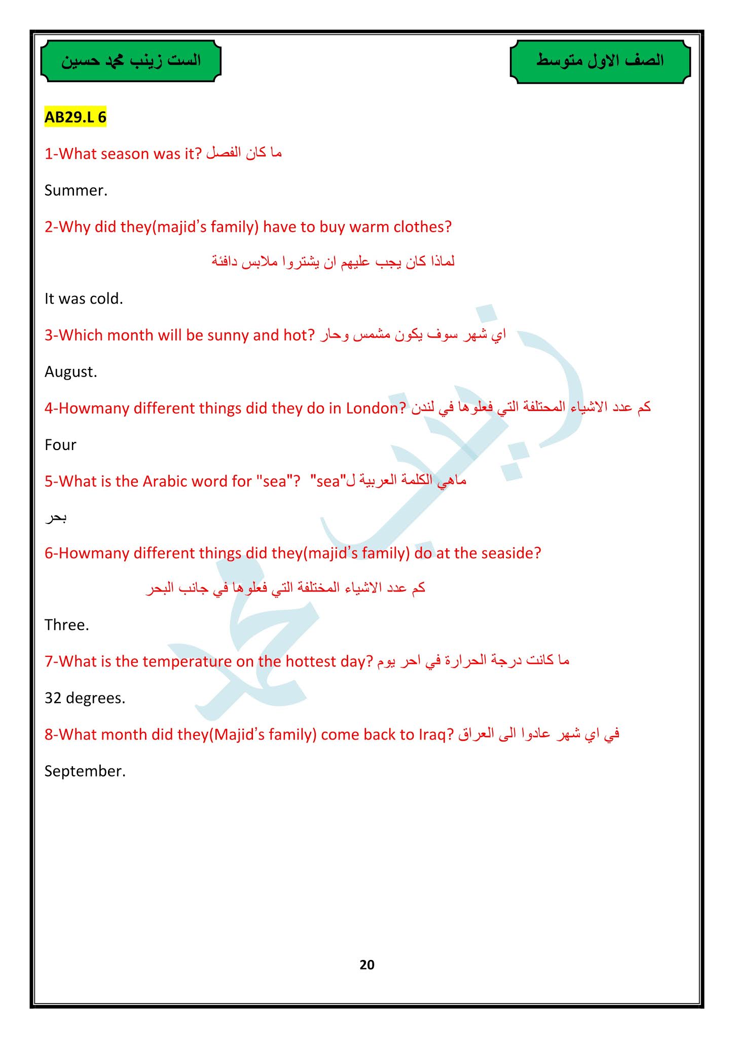 ملخص الوحدة الثانية Unit two انكليزي اول متوسط 2020 مع الانشاء وحلول النشاط اعداد الست زينب محمد حسين