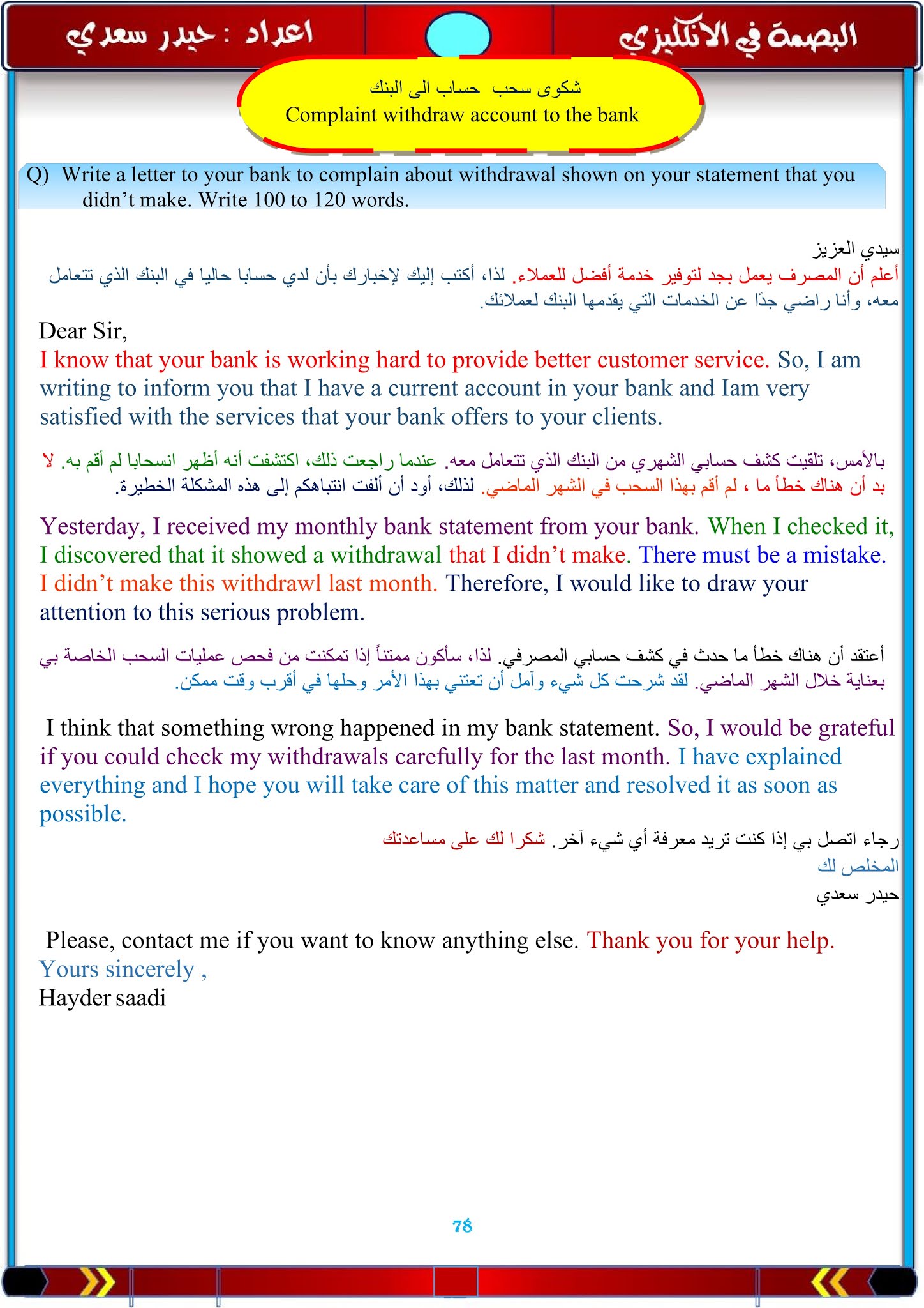 انشاء شكوى سحب حساب الى البنك مع الترجمة كامل