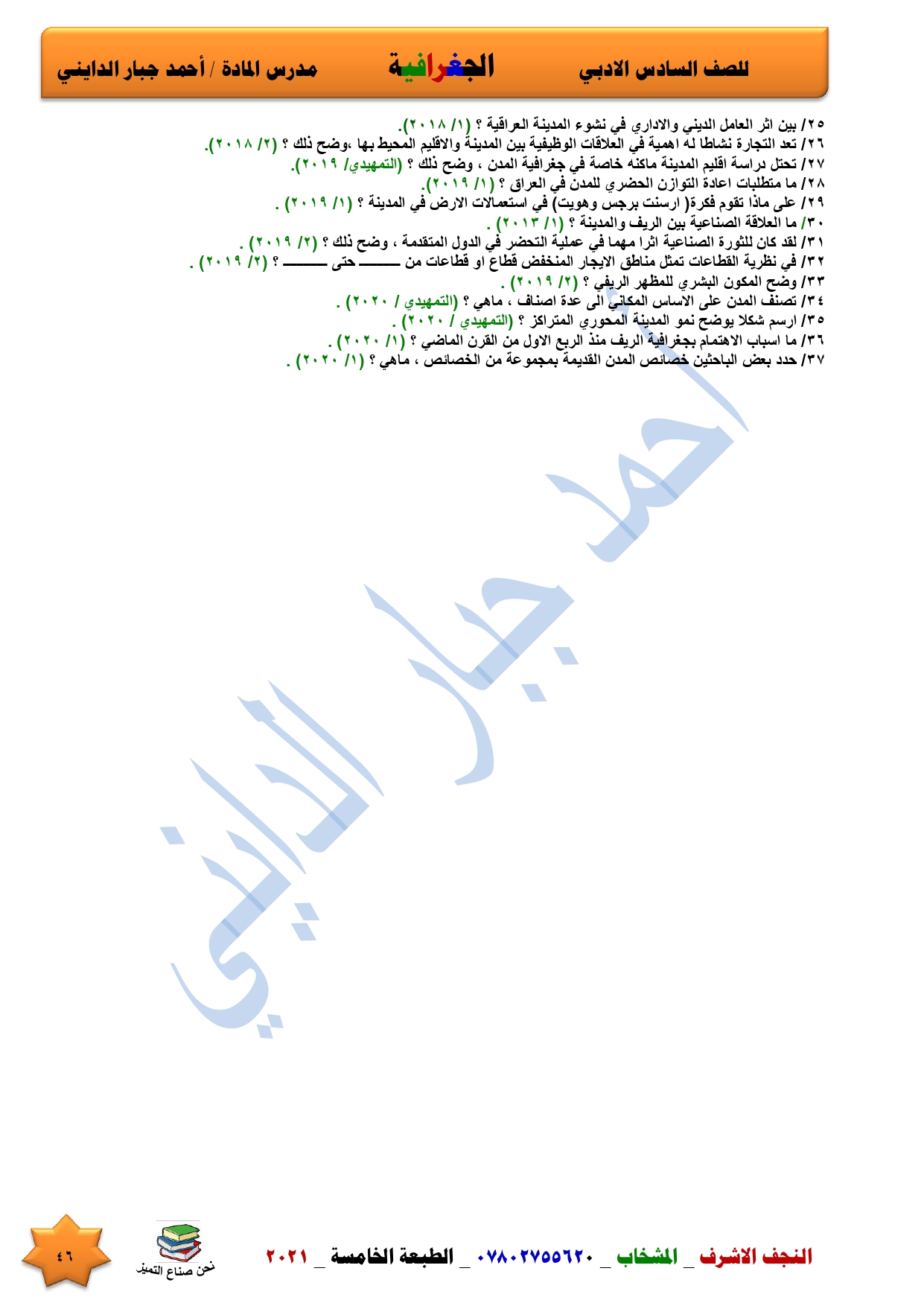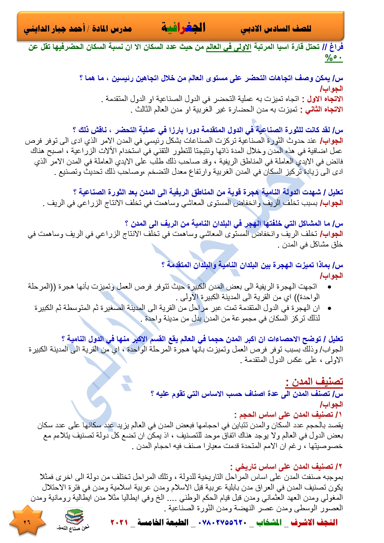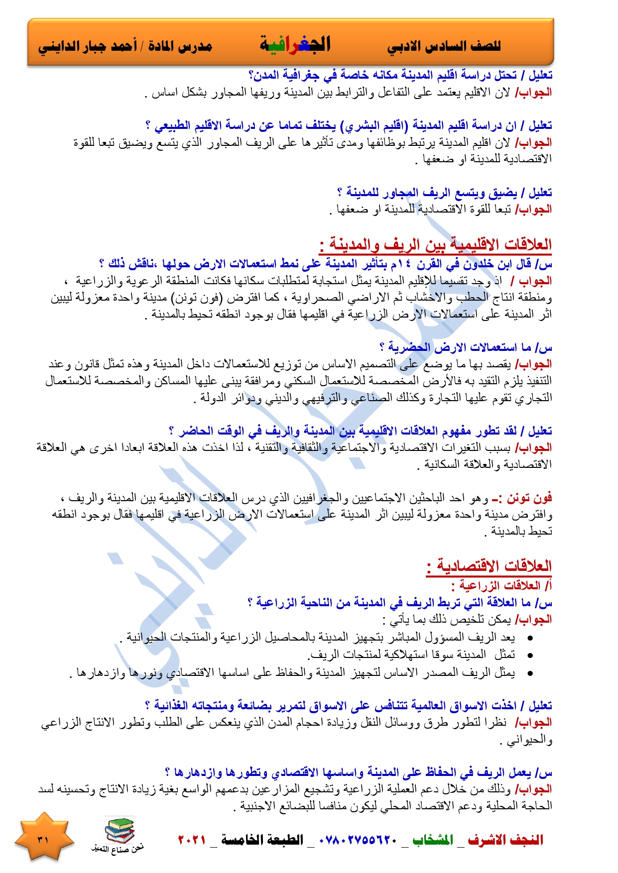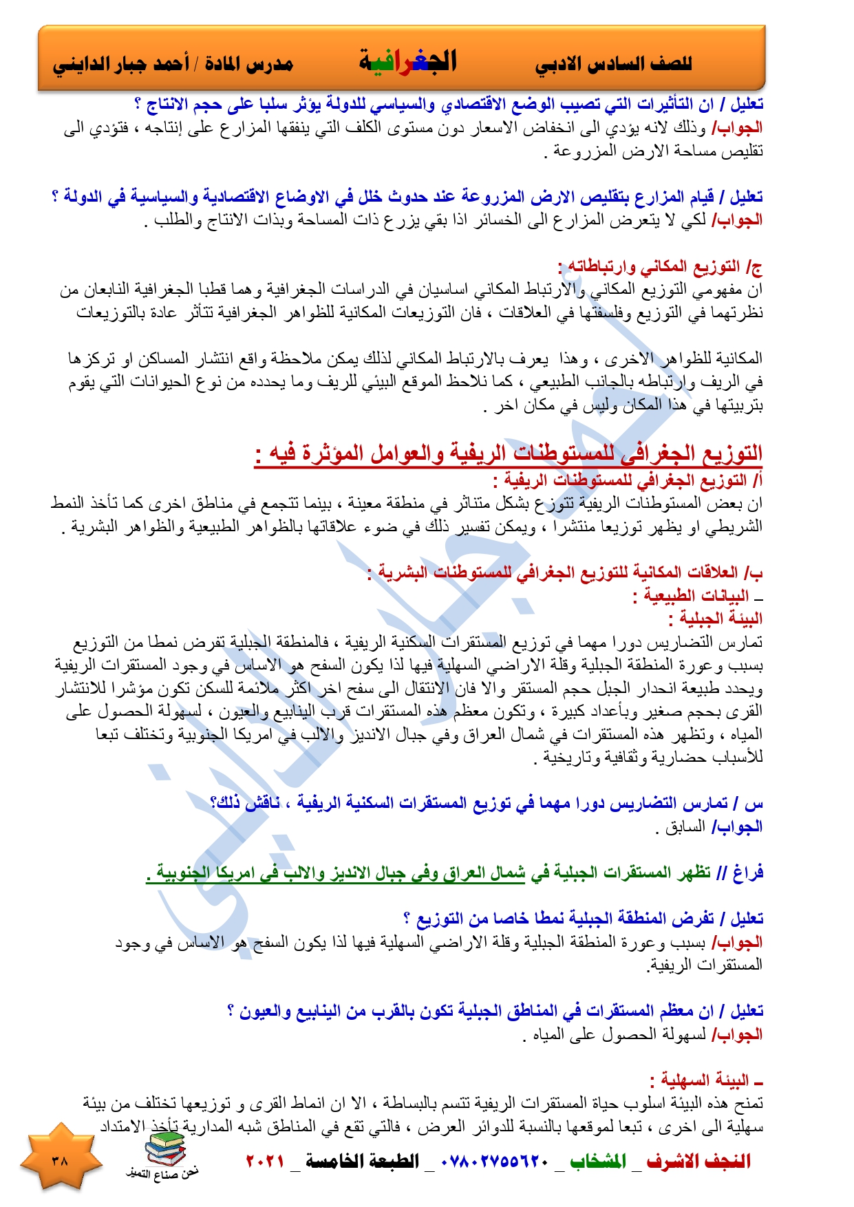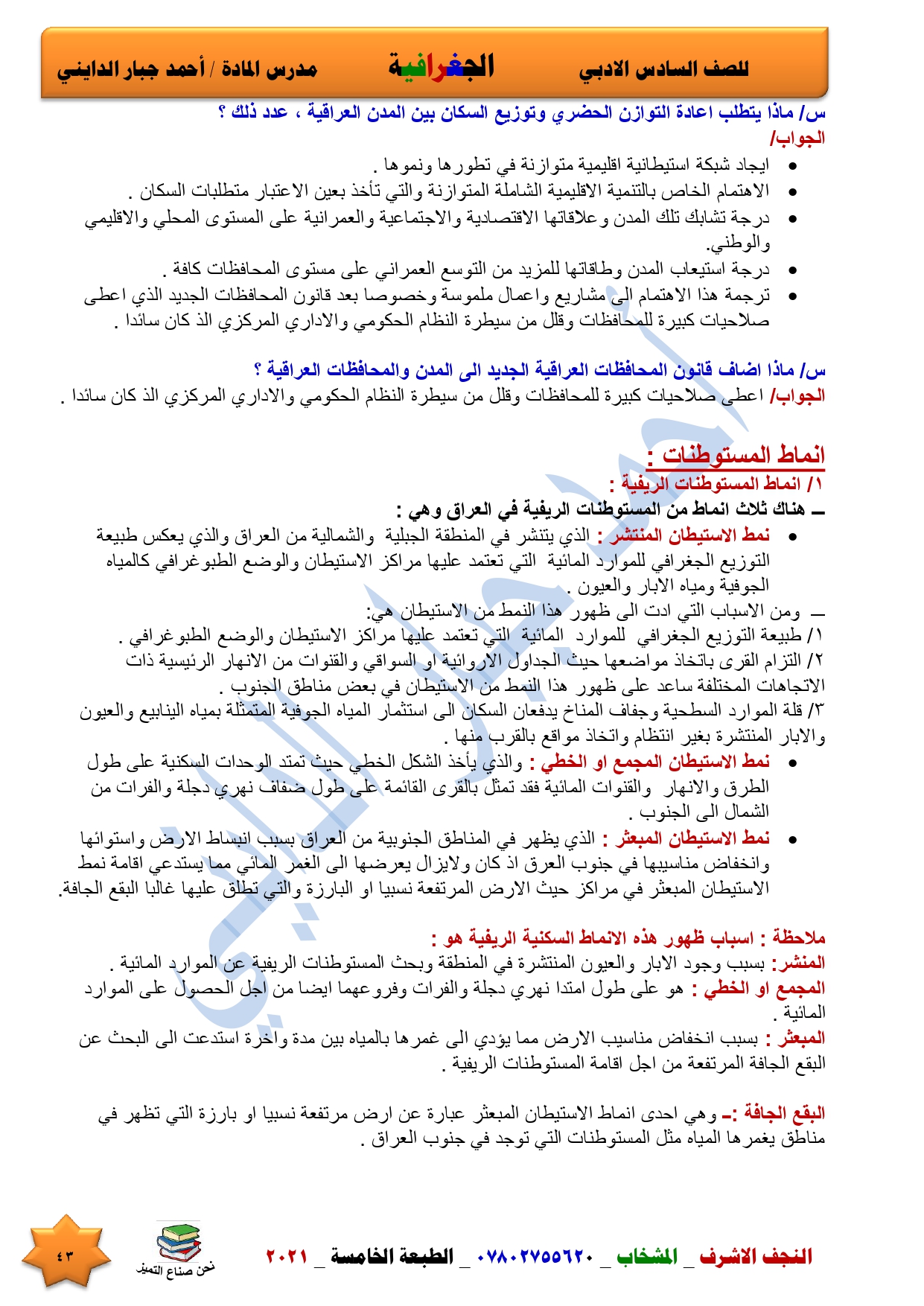 نقدم لكم ملخص لضمان العبور في امتحان الجغرافية ومساعد لطالب السادس الادبي اعداد الاستاذ احمد جبار الدايني