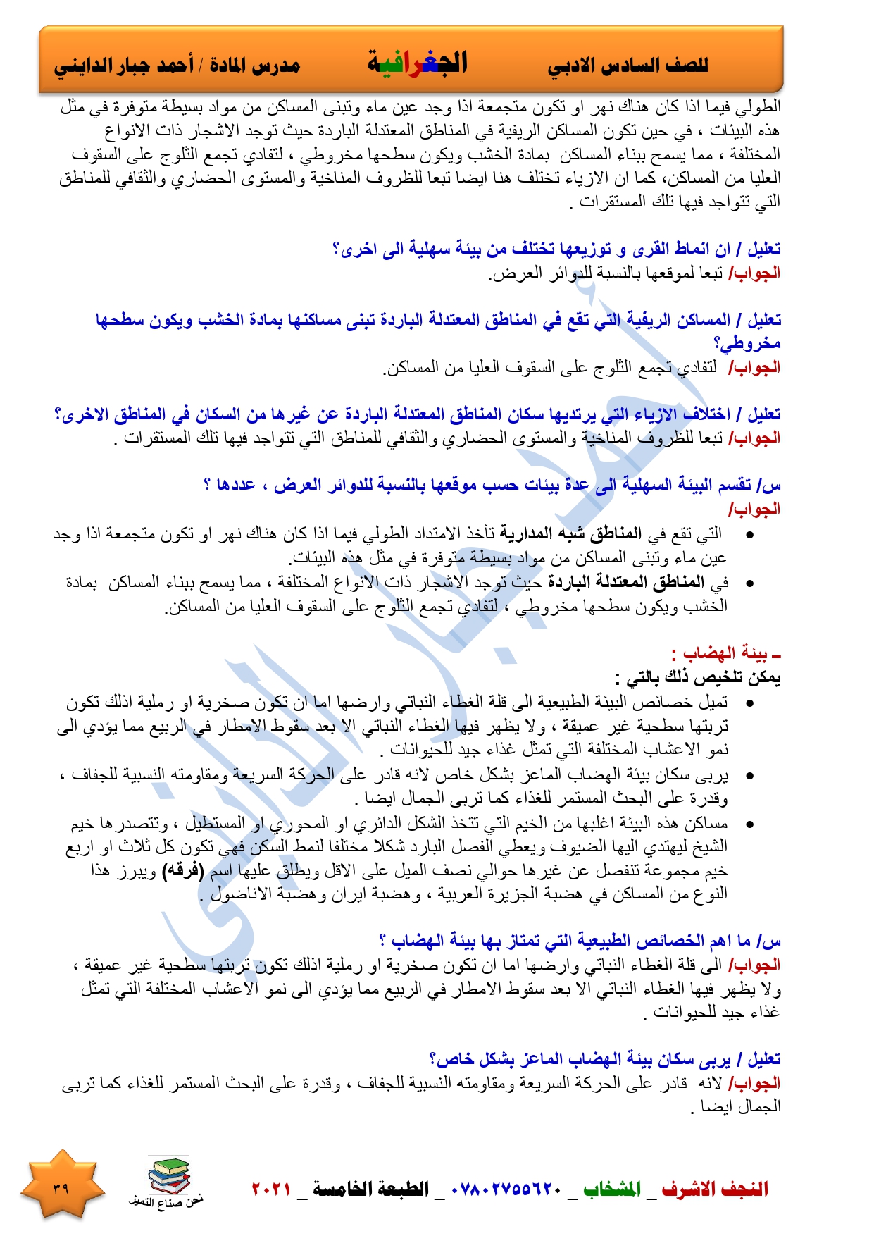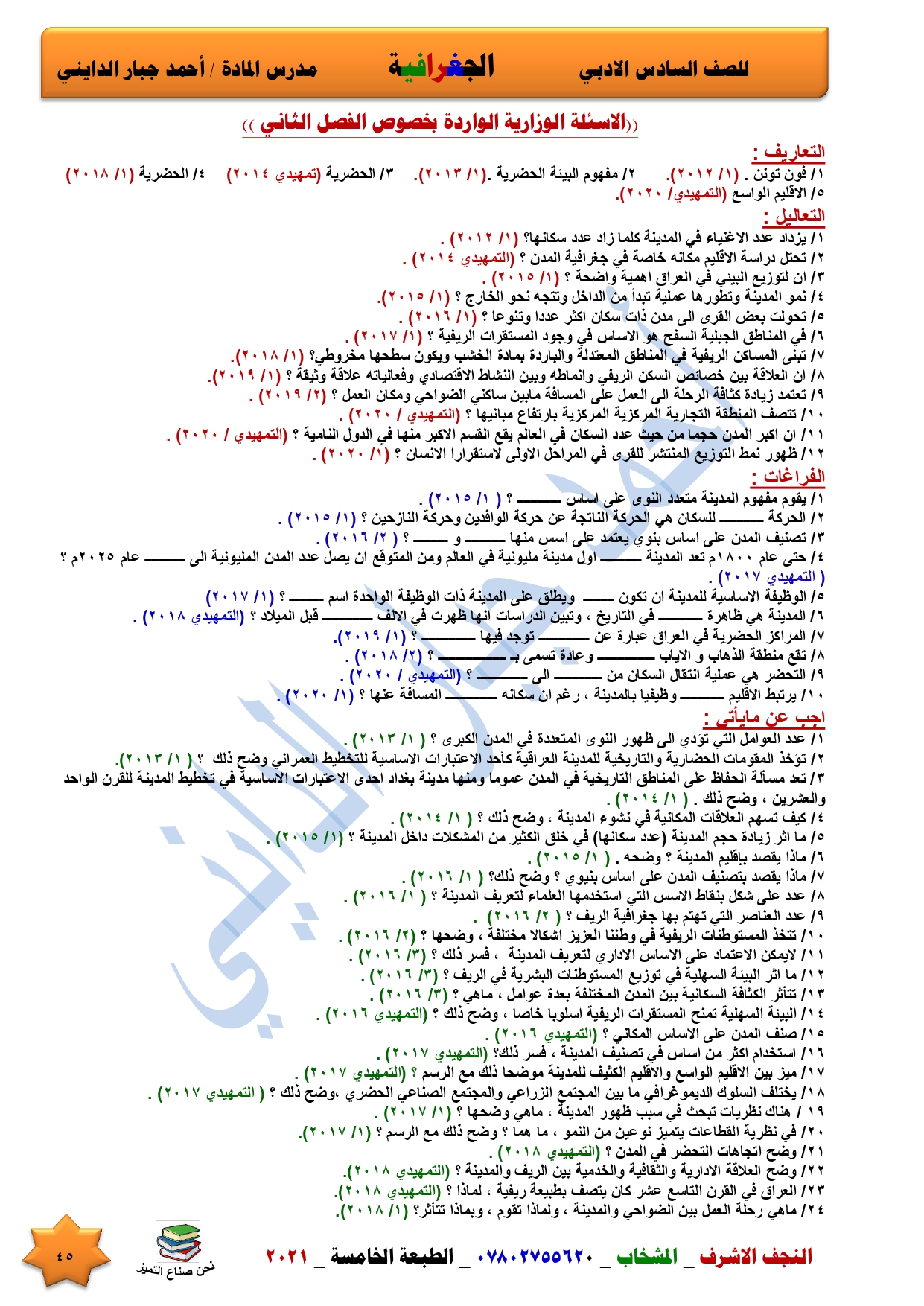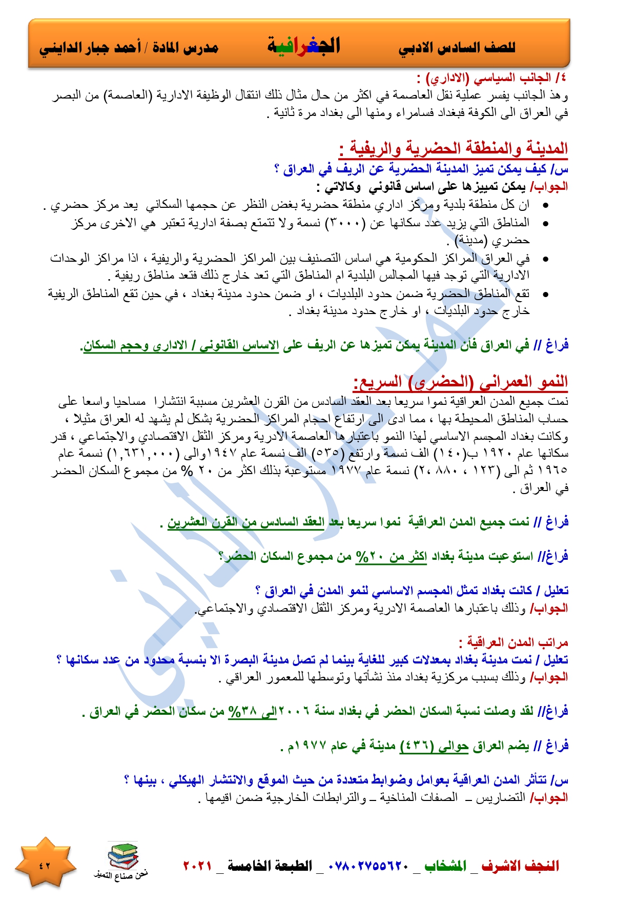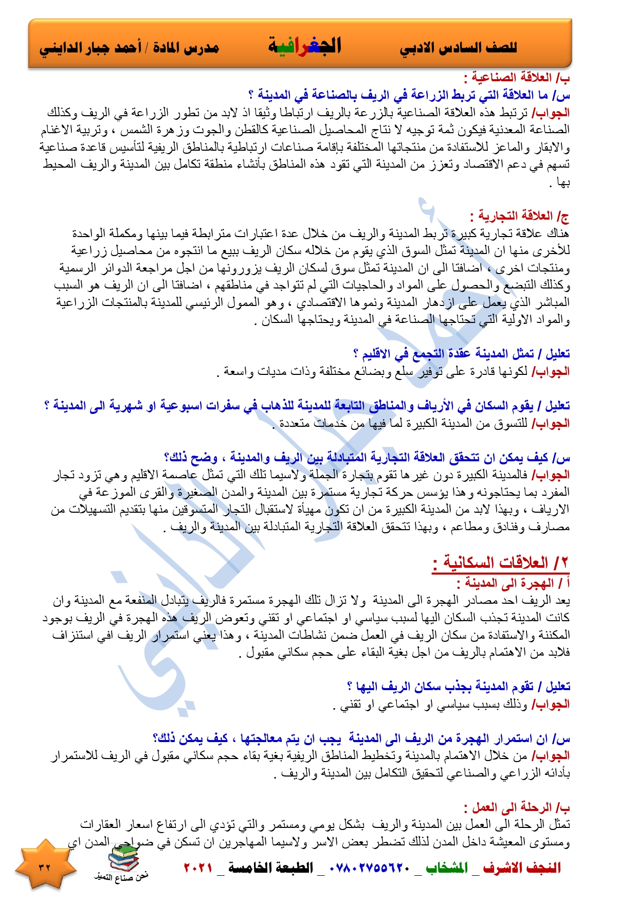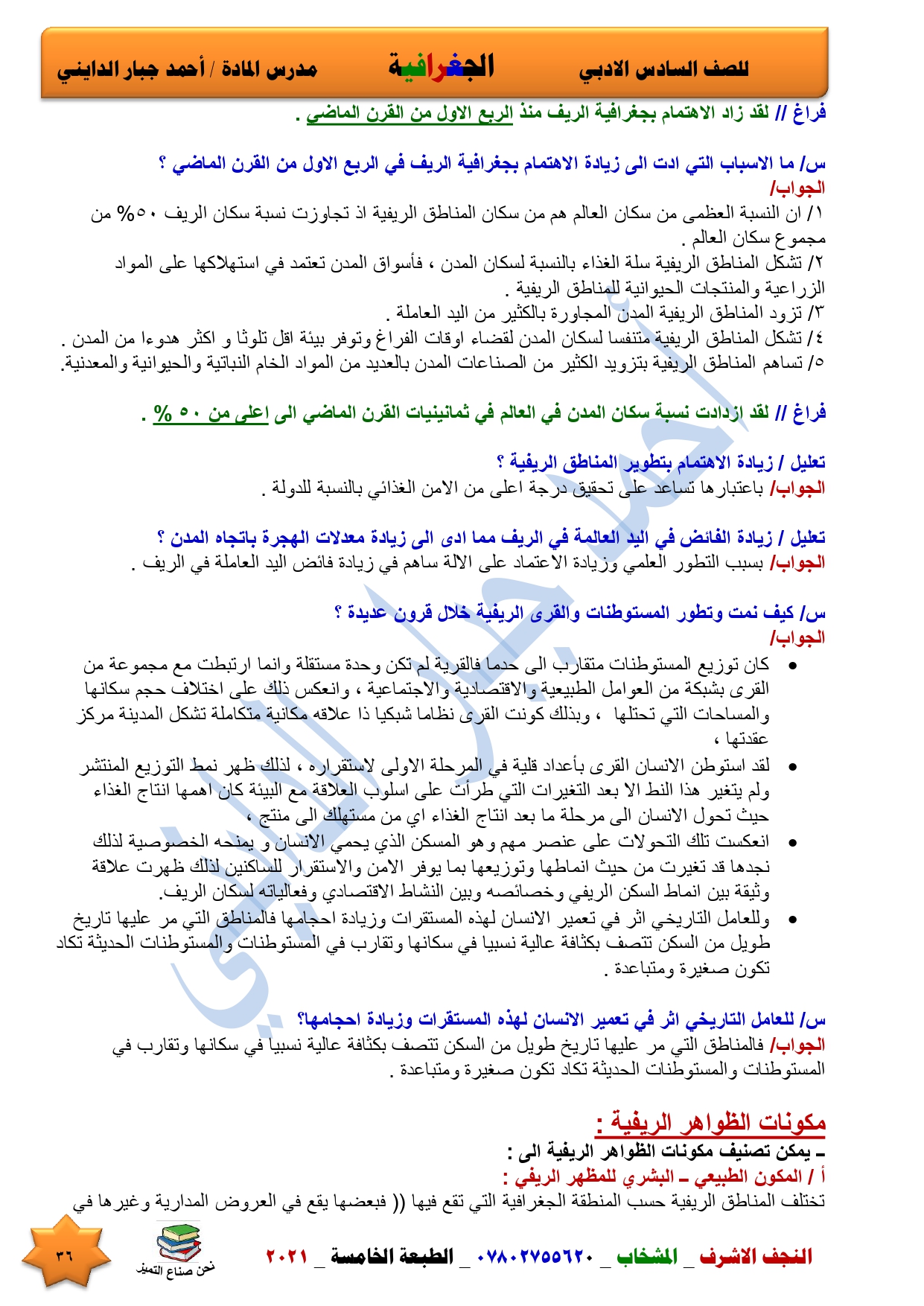 نقدم لكم ملخص لضمان العبور في امتحان الجغرافية ومساعد لطالب السادس الادبي اعداد الاستاذ احمد جبار الدايني