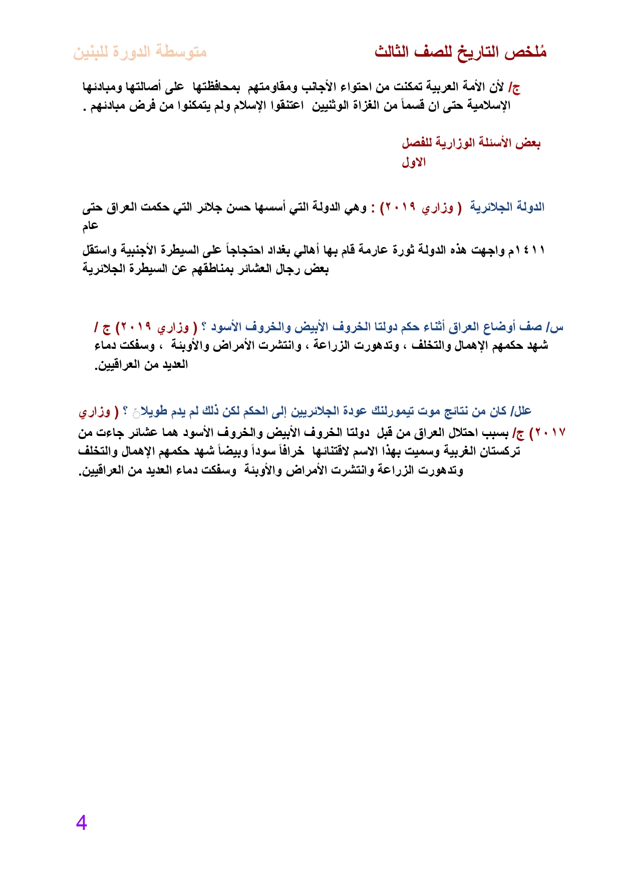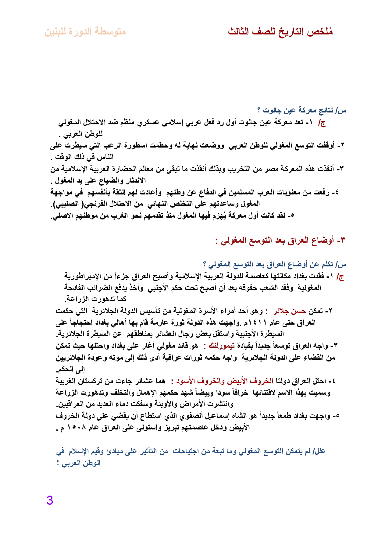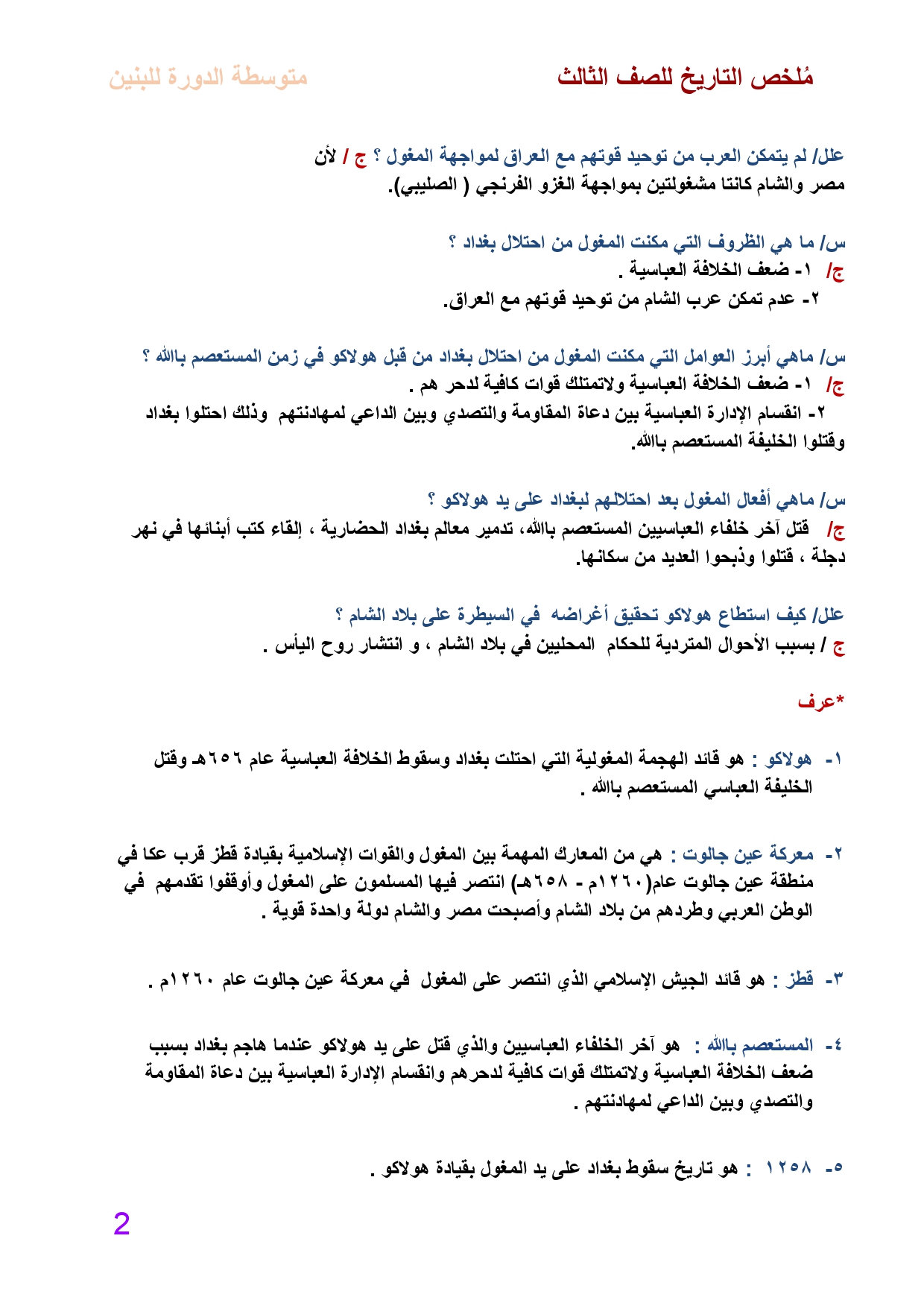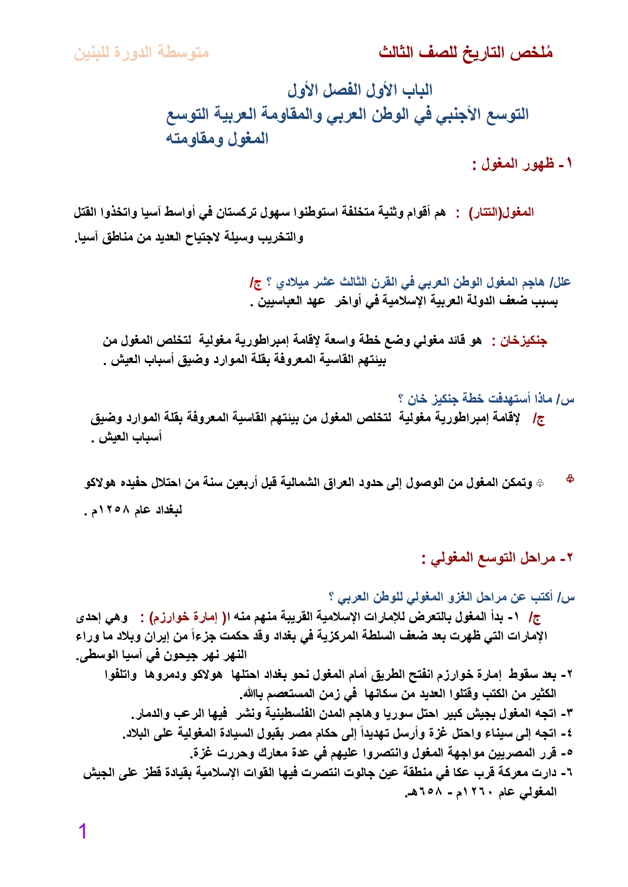 ملخص مادة التاريخ الفصل الاول التوسع المغولي في الوطن العربي (الجزء الاول)