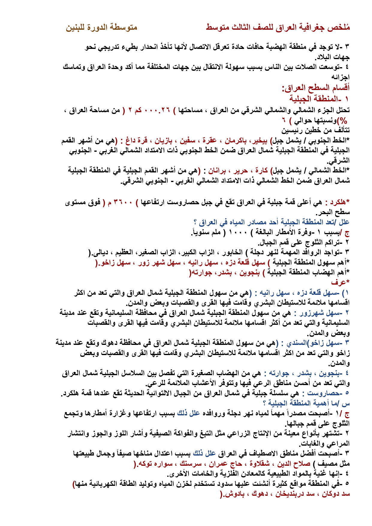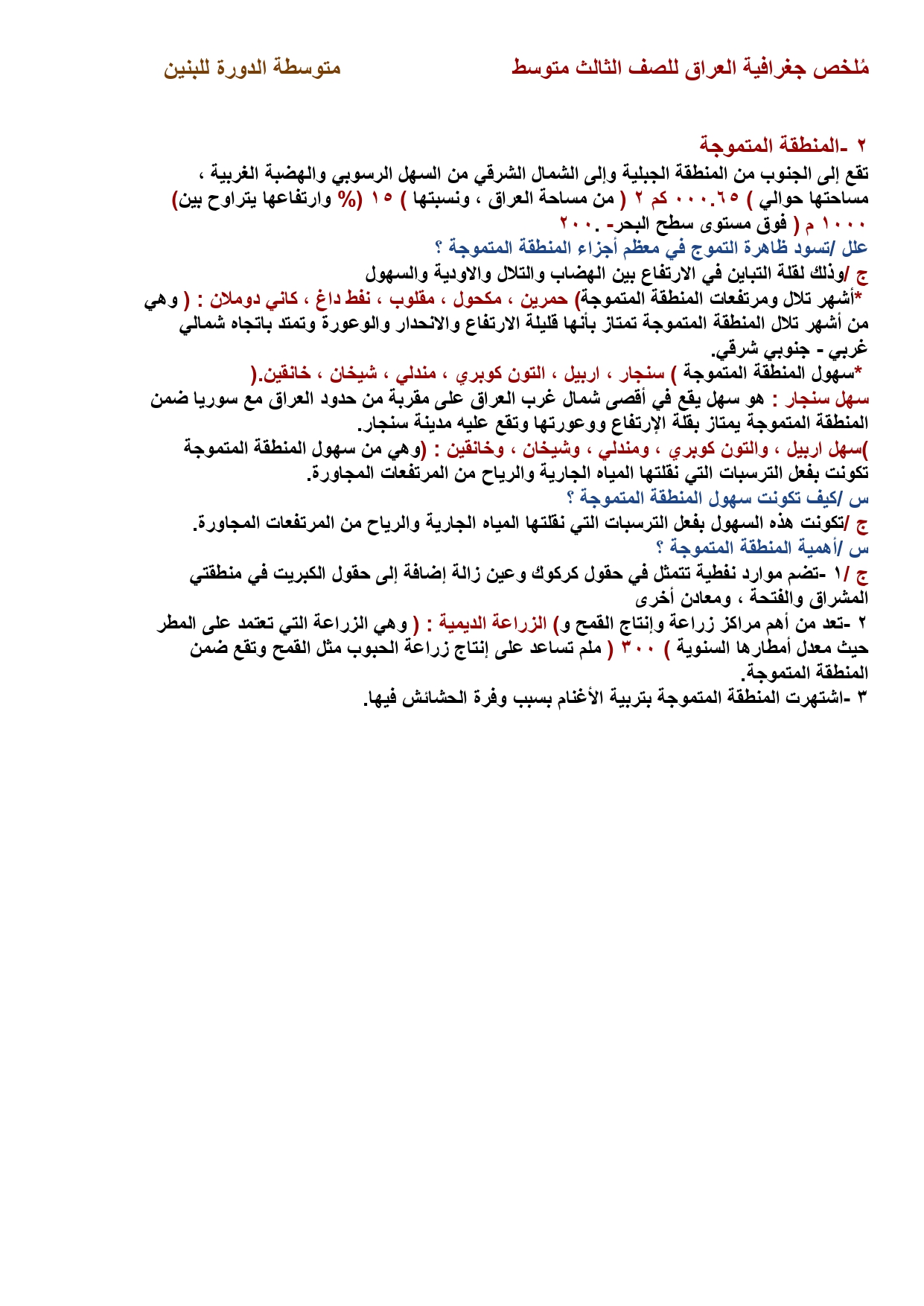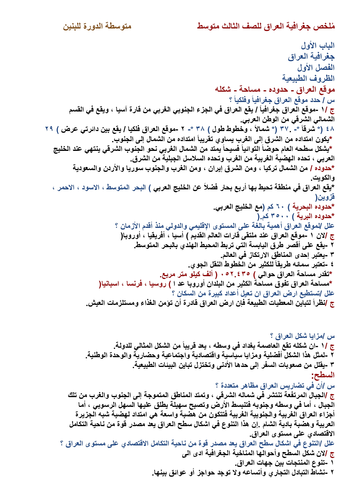 ملخص جغرافية ثالث متوسط الفصل الاول موقع العراق