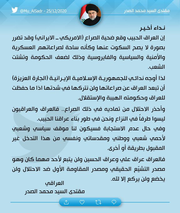 اخر تغريدة لسيد مقتدى والعجيب انها تردع الاحتلال الايراني