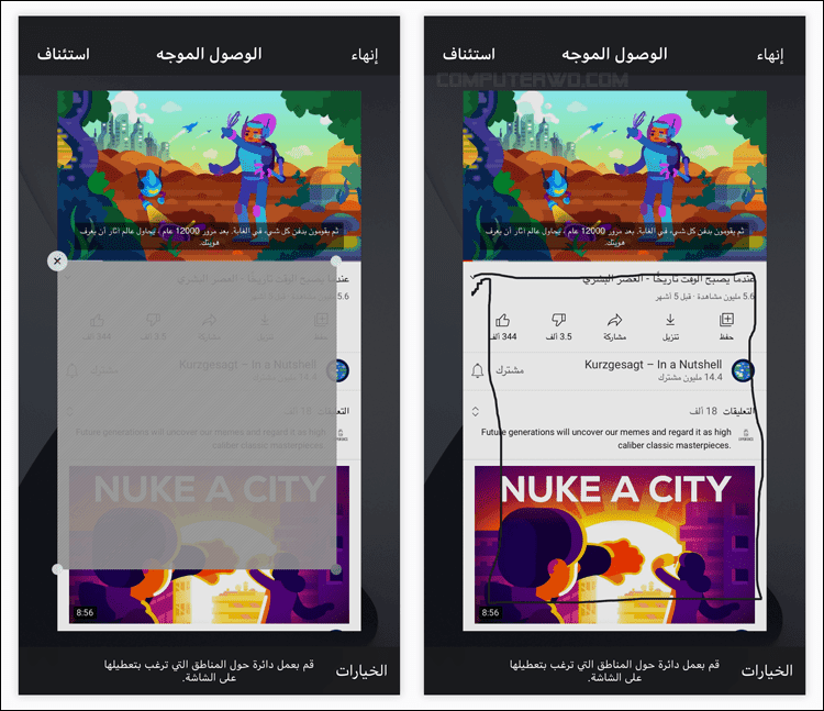 الآن استخدم اصبعك لرسم دائرة أو مربع حول المكان الذي تريد تعطيل استجابة اللمس فيه، فقط تأكد من أن نقطة البداية ونقطة النهاية في الدائرة او المربع تتلقى معًا وسيتم تحديد المنطقة تلقائيًا لتكون مظللة، لاحظ أيضًا أنه يمكنك سحب أي طرف للشكل لتحديد المنطقة بشكل أكثر دقة، بالإضافة إلى القدرة على تحديد أكثر من منطقة لتعطيل أكثر من جزء من الشاشة.