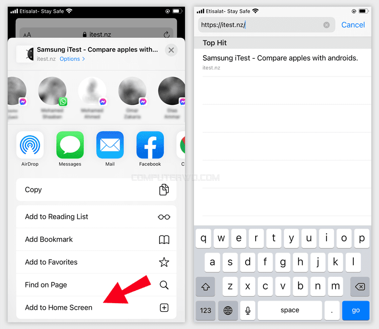 للبدء، كل ما عليك فعله هو التوجه إلى موقع iTest على itest.nz وفي حال كنت تفعل ذلك من خلال جهاز كمبيوتر، فسيتم مطالبتك بمسح كود الـ QR الظاهر على الشاشة لفتح الموقع على الآيفون. لذا يكون من الأفضل لو قمت بفتح الموقع مباشرًة من خلال هاتفك الآيفون، ولاحظ هنا أنه يجب التوجه لأداة iTest من خلال متصفح سفاري فقط، إذا حاولت فتحه على متصفح آخر سيُطلب منك استخدام Safari. وبعد فتح الموقع، اتبع التعليمات التي تظهر على الشاشة والتي تؤدي إلى إضافة iTest للشاشة الرئيسية على الآيفون الخاص بك. لفعل ذلك، اضغط على أيقونة Share الموجودة بمنتصف الشريط السفلي ثم اسحب القائمة لأعلى واضغط على خيار "Add to Home Screen" اضف إلى الشاشة الرئيسية.