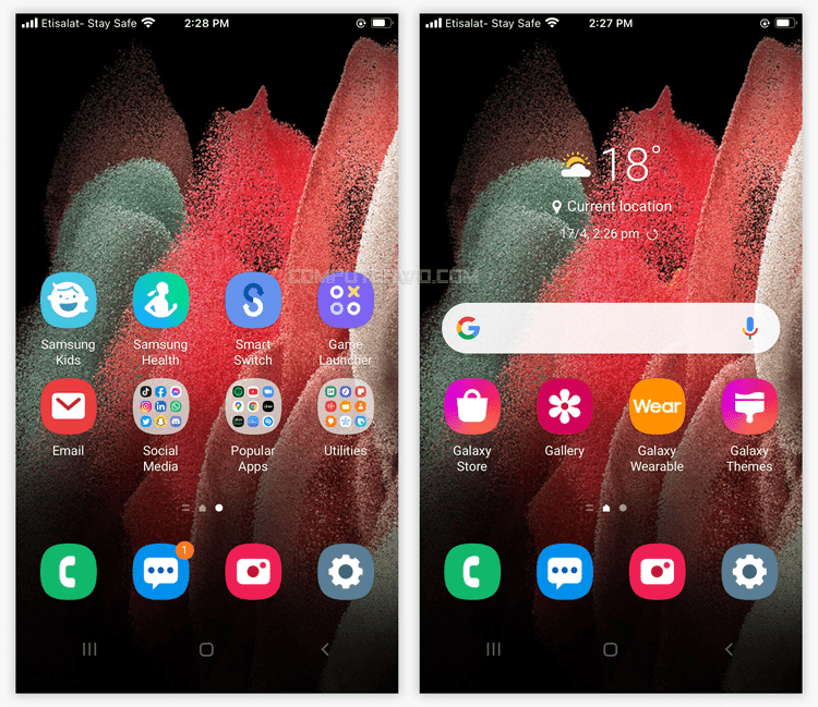 لذلك، ستجد مثلًا أنه باستطاعتك السحب إلى أسفل لعرض شريط الحالة ولكن جميع الخيارات فيه وهمية وليس لها تأثير. يمكنك فتح تطبيق Gallery وتصفح مجموعة من الصور المخزنة مسبقًا، وكذلك فتح تطبيق الرسائل للعثور على محادثات نصية تم إجراؤها من قبل، بل ويمكنك حتى تغيير مظهر الواجهة من خلال الثيمات الموجودة في تطبيق Galaxy Themes أو تصفح متجر Galaxy. هذا نوع من التفاعل، بينما يوجد نوع آخر يتيح لك إلقاء نظرة على شاشة البداية الخاصة بالتطبيق فقط، مثل تطبيق Settings الذي يمكنك فتحه ورؤية الأقسام المتضمنة فيه لكن لن تستطيع فتح اي قسم او التلاعب بالاعدادات. كذلك تطبيق الكاميرا، حيث يمكن التنقل بين وضع التصوير او تسجيل فيديو او التصوير بالبطيء وتجربة ميزات الكاميرا من مسامسونج، وذلك عبر فيديو مُسجل بشكل مُسبق للتجربة عليه.