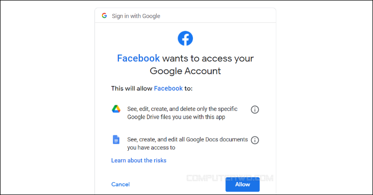 وبما أنك قد قمت باختيار Google Docs فسيتم تحويلك إلى صفحة تسجيل الدخول إلى حساب جوجل الخاص بك، افعل ذلك وسيتعين عليك منح فيسبوك إمكانية الوصول إلى خدمتي Google Drive و Google Docs بما ان هذه هي المرة الاولى التي تستخدم فيها أداة فيسبوك لنقل البيانات. لذا اضغط على "Allow" سماح لمتابعة الخطوات.