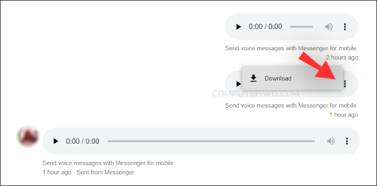 بمجرد فتح المحادثة والتمرير فيها، ستجد أن الرسائل الصوتية يتم تشغيلها بواسطة مُشغل الوسائط التابع لمتصفح الويب المُستخدم وليس مُشغل فيسبوك، هذا يعني أنه يمكن تنزيل أي رسالة صوتية بعد الضغط على زر القائمة ( ⁝ ) ثم "Download" حيث سيتم مطالبتك بتحديد مكان الاحتفاظ بالملف على الكمبيوتر وبعدها يبدأ التنزيل. لكن يجب الآخذ في الاعتبار أن ملفات الرسائل الصوتية التي يتم تحميلها ستكون بصيغة MP4 وبالتالي يمكن الاستماع لمحتوى الرسالة بواسطة مُشغلات الفيديو، او يمكن استخدام أداة CloudConvert لتحويلها إلى MP3 للتعامل معها على انها ملفات صوتية.
