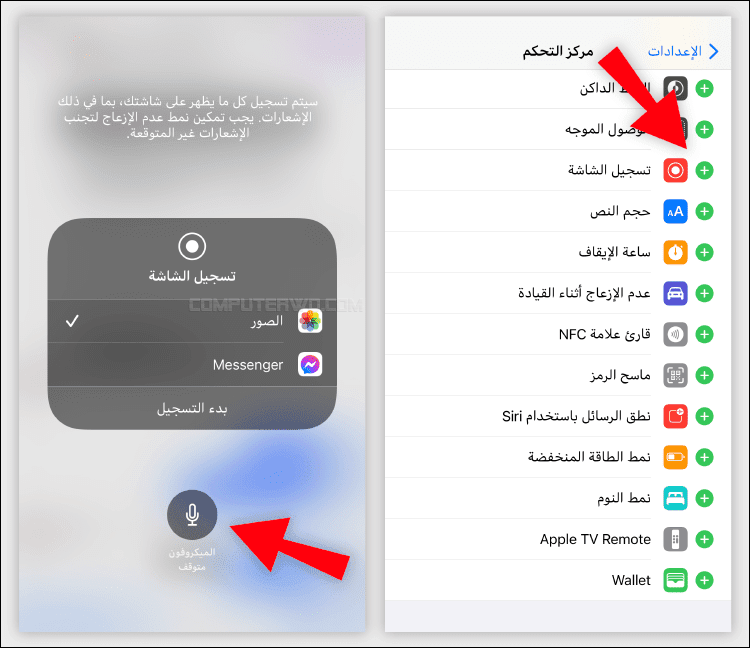 لفعل ذلك، قم بفتح "الإعدادات" Settings ثم توجه إلى قسم "مركز التحكم" Control Center وقم بالتمرير لأسفل حتى تضغط على علامة زائد ( + ) بجوار "تسجيل الشاشة" Screen Recording. وبعد الانتهاء، قم بفتح تطبيق Messanger وأفتح المحادثة التي تحتوي الرسائل الصوتية ثم افتح مركز التحكم عن طريق السحب لأعلى من الحافة السفلية، أو اسحب لأسفل من أعلى يسار الشاشة. الآن اضغط مطولًا على زر التسجيل الموجود بالأسفل وبعدها تأكد من تعطيل الميكروفون، وذلك حتى لا يتدخل أي صوت خارجي أثناء تسجيل الرسالة الصوتية، فالغرض هو تسجيل الصوت الداخلي للهاتف فقط. بعد ذلك اضغط على "بدء التسجيل".