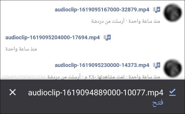 بعد فتح المحادثة المطلوبة، ستلاحظ أن الرسائل الصوتية المضمنّة في المحادثة تظهر على شكل ملفات mp4 ولا يمكن تشغيلها بواسطة المتصفح نفسه، بل يجب تحميلها على جهازك. بالنظر إلى أن هذا ما نحتاجه اصلًا، فكل ما عليك الآن هو النقر على الرسائل الصوتية المعروضة أمامك وسيبدأ المتصفح بتنزيلها على الفور. يمكنك بعد الانتهاء فتح تطبيق "ملفاتي" أو "الملفات" أو ايًا كان تطبيق إدارة الملفات على هاتفك الاندرويد وستجد جميع الرسائل الصوتية مخزنة في مجلد "الصوت" بصيغة mp4. يمكنك، إذا أردت، استخدام تطبيق مثل Video Converter لتحويلها إلى ملفات صوتية بصيغة mp3.