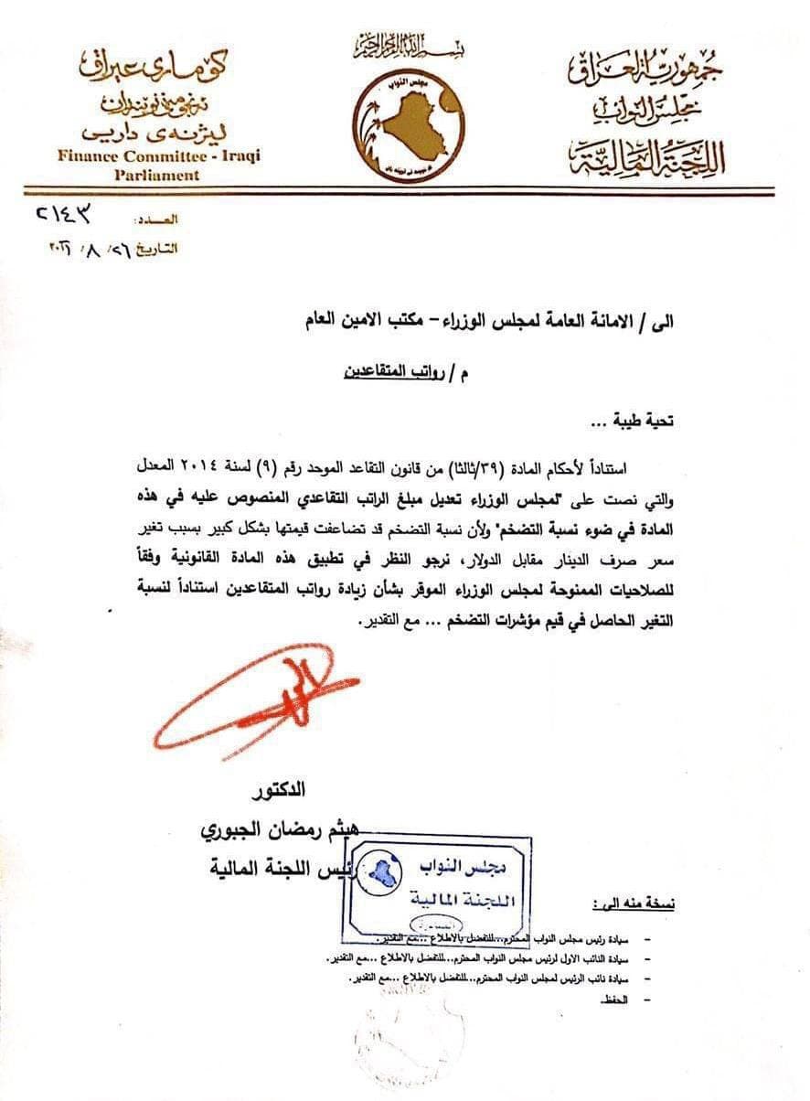 رئيس اللجنة المالية يخاطب الأمانة العامة لمجلس الوزراء لزيادة رواتب المتقاعدين