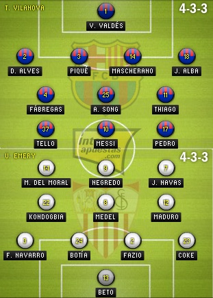 أما في خط الهجوم فنجد ميسي وبيدرو وتيو مع غياب كل من إنييستا وأليكسيس واستمرار غياب دافيد فيا الذي عانى من بعد الآلام في القولون والكلى.