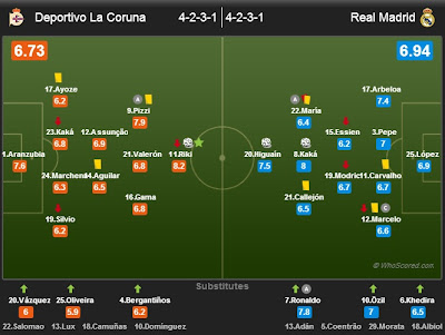 في تقييم الفريقين الليلة بعد المباراة الصعبة التي خاضها الريال، نجد أن النادي الملكي تفوق بأفضلية طفيفة على أصحاب الأرض حيث نال لاعبوه ما معدله 6.94 من 10 فيما نال لاعبو لاكورونيا معدل إجمالي بلغ 6.73.