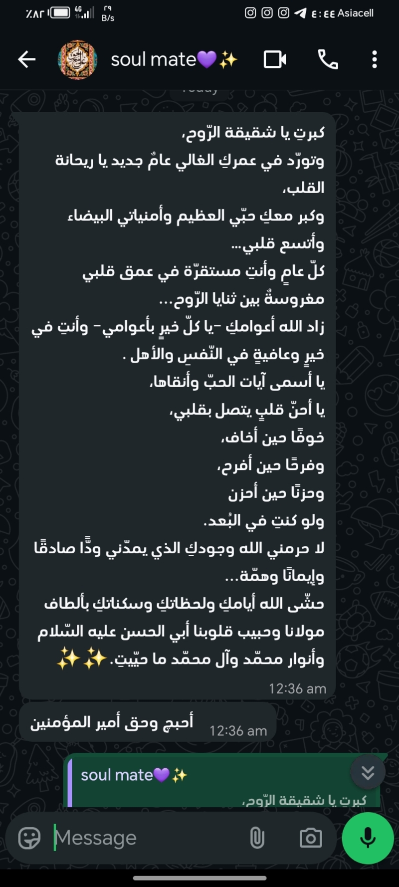 أيتها الحانية لازادني الله يوما دونكِ، يا سعادتي ومُقلتي، فَدتكِ نفسي وروحي، هل لكِ أن تعلمين كيف أُحبكِ!!؟