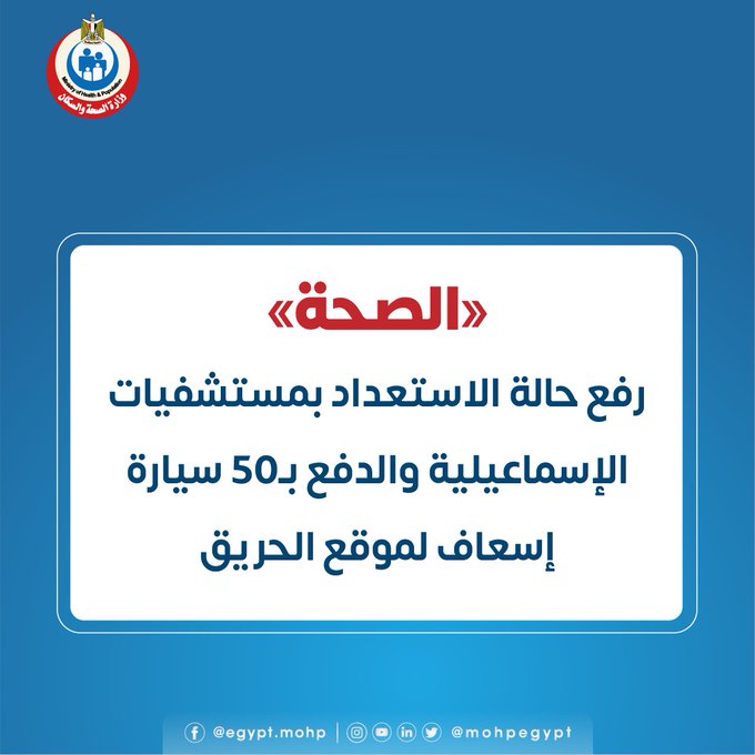 وأرسلت وزارة الصحة 50 سيارة إسعاف إلى مكان الحريق، بينما توجهت إلى الاسماعيلية طائرتان عسكريتان.