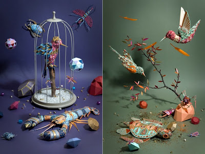 فهم يستخدمان بعض قصاصات الورق إضافة إلى اللاصق والمشرط والمقص في صناعة منحوتات قمة في الجمال والإبداع للطيور والحشرات وجراد البحر