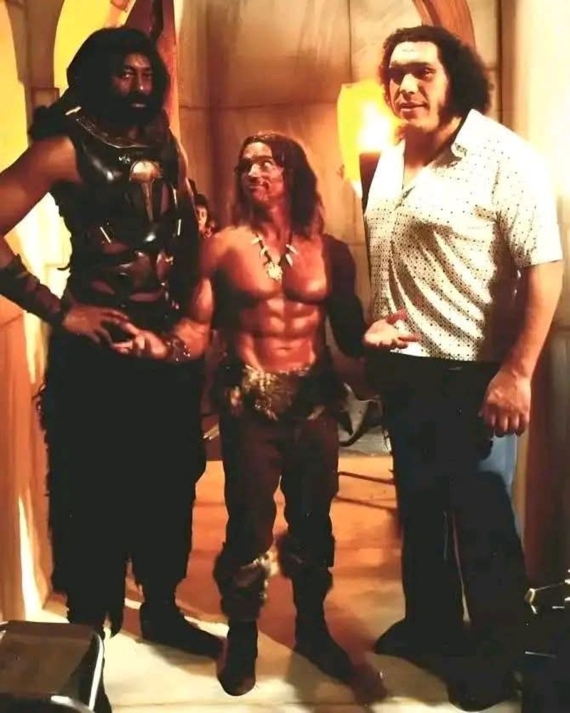 هذا القصير الذي في المنتصف هو آرلوند شوارزنجر بحد ذاته بطوله 190 سم بين تشامبرلين والممثل والمصارع الشهير اندريه العملاق .. في كواليس فلم كونان المدمر 1984