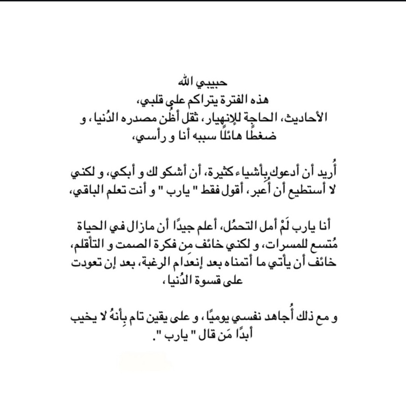 ‏امنحني يا الله القدرة على رؤية الرحمة المبطّنة في كل ما قسمت، وعلى اكتشاف اللطف الخفيّ في مكتوبك الذي حكمت، وعلى الامتنان لك، أن يبقى قلبي مُمتنًّا شاكرًا زاهدًا في القنوط كما علّمتهُ دائمًا أن يفعل.