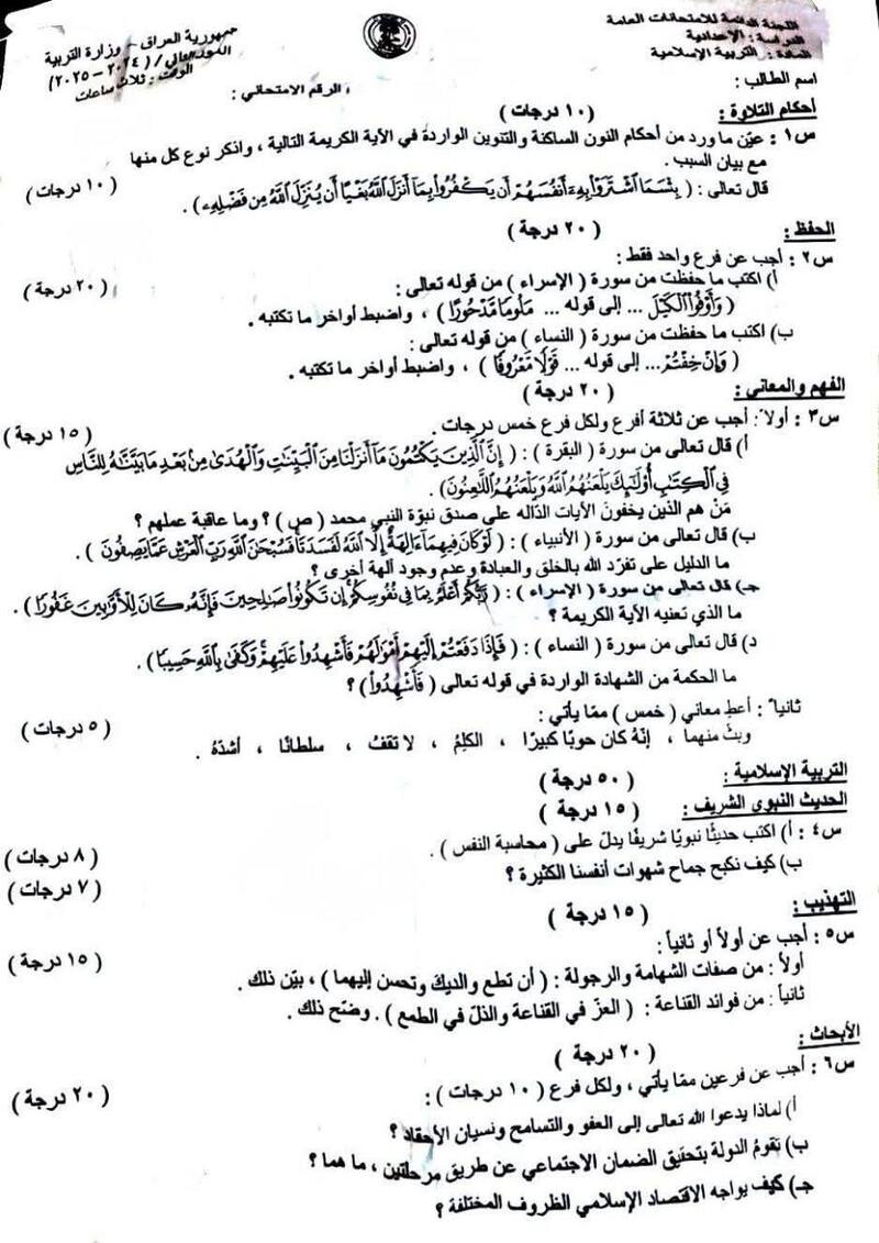 أسئلة التربية الإسلامية للصف السادس الإعدادي الدور الثاني ٢٠٢٥